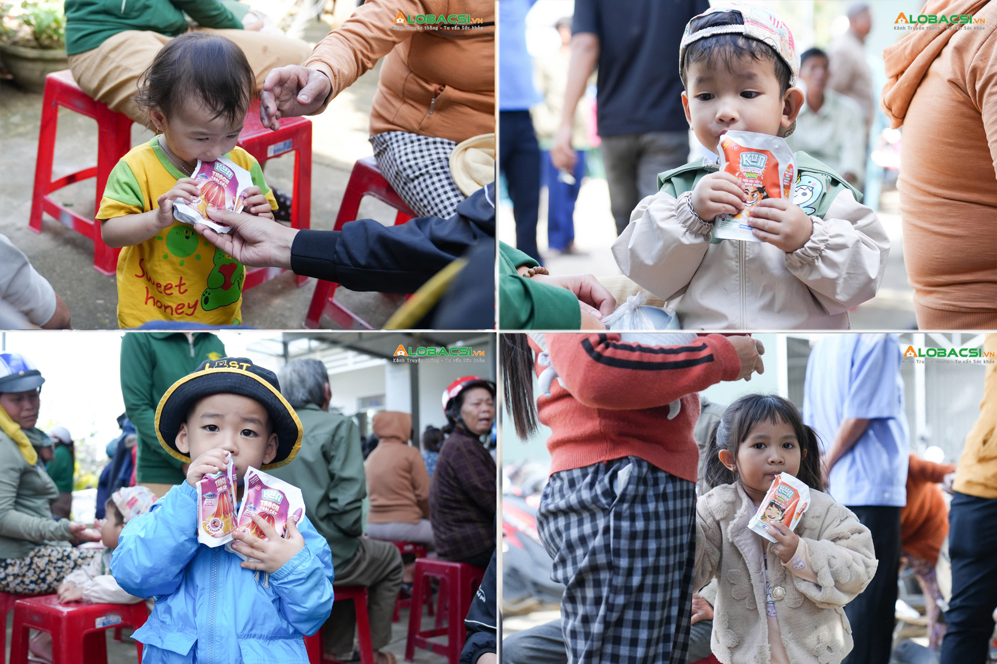 Được phát cho túi sữa Kun, giục mãi, bà xé góc nhỏ hút nhè nhẹ một hơi, khen “ngon qué”. Rồi lại nắm chặt miệng túi, “Không uống nữa”. Người ngồi bên cạnh: “Ý là bả muốn để dành cho cháu đó mà”.