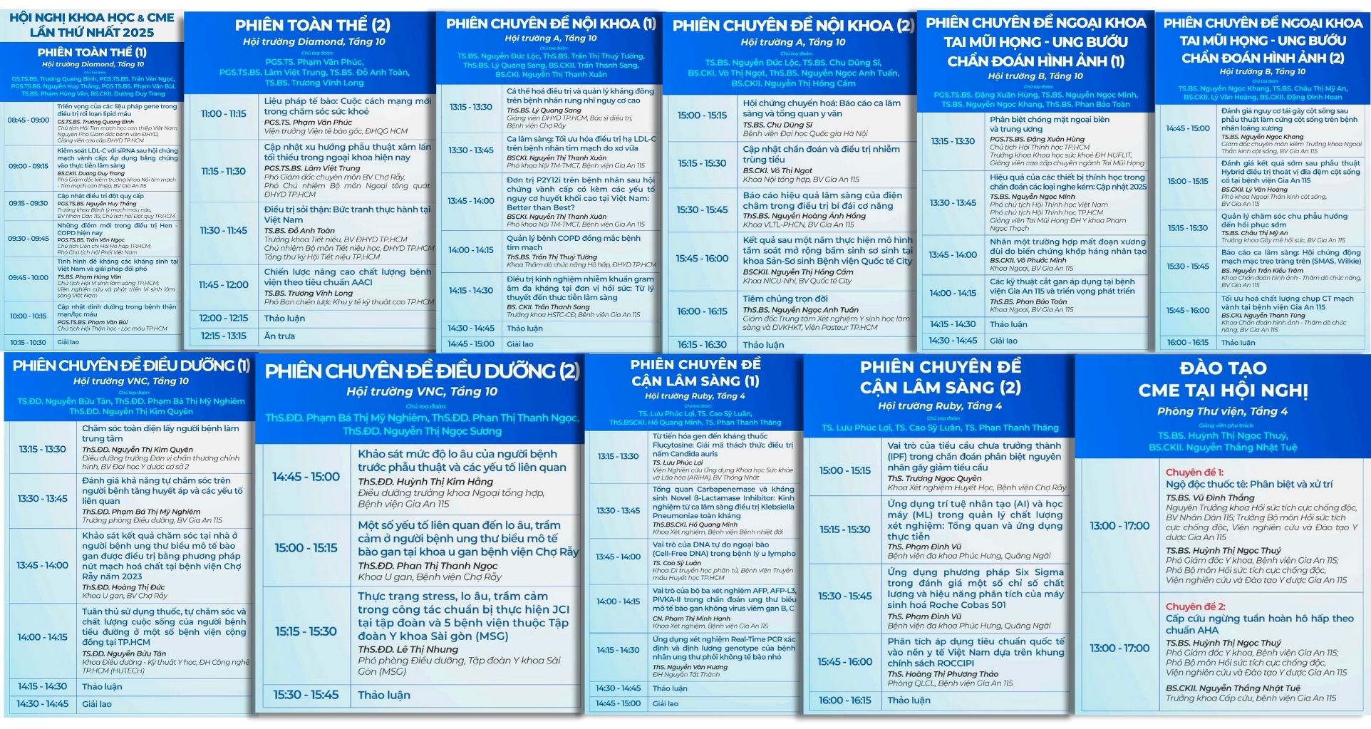 Song song đó là 35 báo cáo ở 4 phiên chuyên đề, mang đến những góc nhìn cập nhật và đột phá về điều trị hiện đại, nổi bật ở các lĩnh vực: liệu pháp gene trong rối loạn lipid máu, quản lý hen - COPD, đề kháng kháng sinh, bệnh thận mạn, dinh dưỡng trong lọc máu, đột quỵ cấp, hội chứng mạch vành, liệu pháp tế bào, điều trị sỏi thận và phẫu thuật robot. Song song phiên toàn thể, bốn phiên chuyên đề cũng diễn ra liên tục, bao phủ các khối nội, ngoại, tai mũi họng, ung bướu, chẩn đoán hình ảnh, điều dưỡng, cận lâm sàng. Nội dung tập trung vào tiến bộ lâm sàng và xu hướng điều trị toàn diện, giúp nâng cao hiệu quả chăm sóc người bệnh.