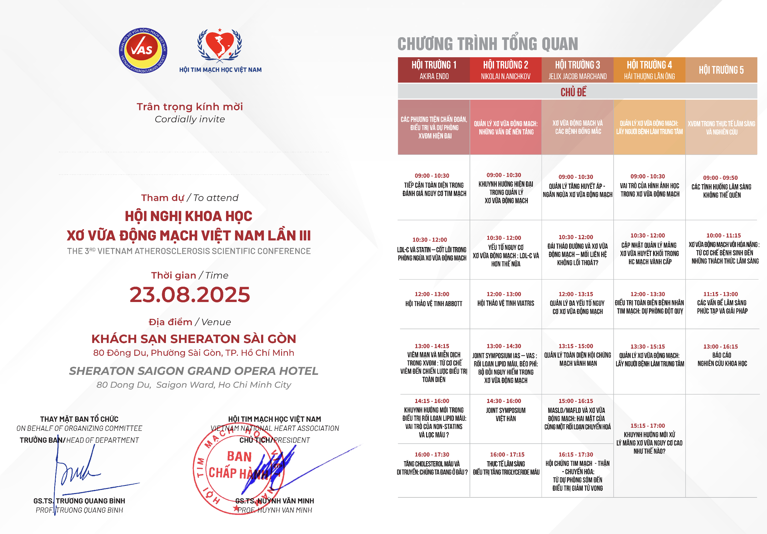 Ngày 23/8/2025, tại Khách sạn Sheraton Saigon (TPHCM), Phân hội Xơ vữa Động mạch Việt Nam (thuộc Hội Tim mạch học Việt Nam) sẽ tổ chức Hội nghị Khoa học Xơ vữa Động mạch Việt Nam lần III. Sự kiện quy tụ các chuyên gia tim mạch trong và ngoài nước, cập nhật tiến bộ mới về cơ chế bệnh sinh, liệu pháp hạ mỡ máu, kiểm soát huyết áp, chẩn đoán hình ảnh và các nghiên cứu khoa học, nhằm mở rộng góc nhìn và tối ưu hóa điều trị cho người bệnh.