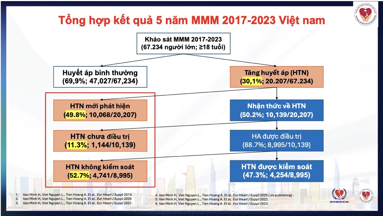 Tại Việt Nam, WHO dự báo đến năm 2025, 1/3 người trưởng thành có thể mắc THA, tương đồng kết quả tầm soát MMM (33%). Tỷ lệ kiểm soát huyết áp trong nước đạt gần 50%, cao hơn nhiều quốc gia, nhưng bệnh đang trẻ hóa rõ rệt do lối sống ít vận động, stress kéo dài, thừa cân, béo phì và chế độ ăn nhiều muối.