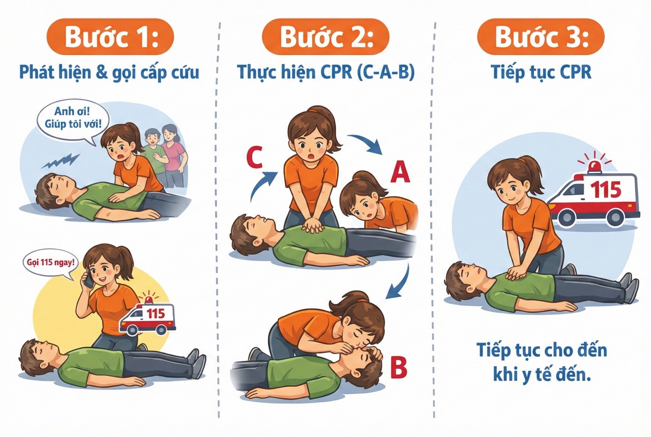 Ngay khi phát hiện người bệnh bất tỉnh, không thở hoặc thở ngáp, hãy: