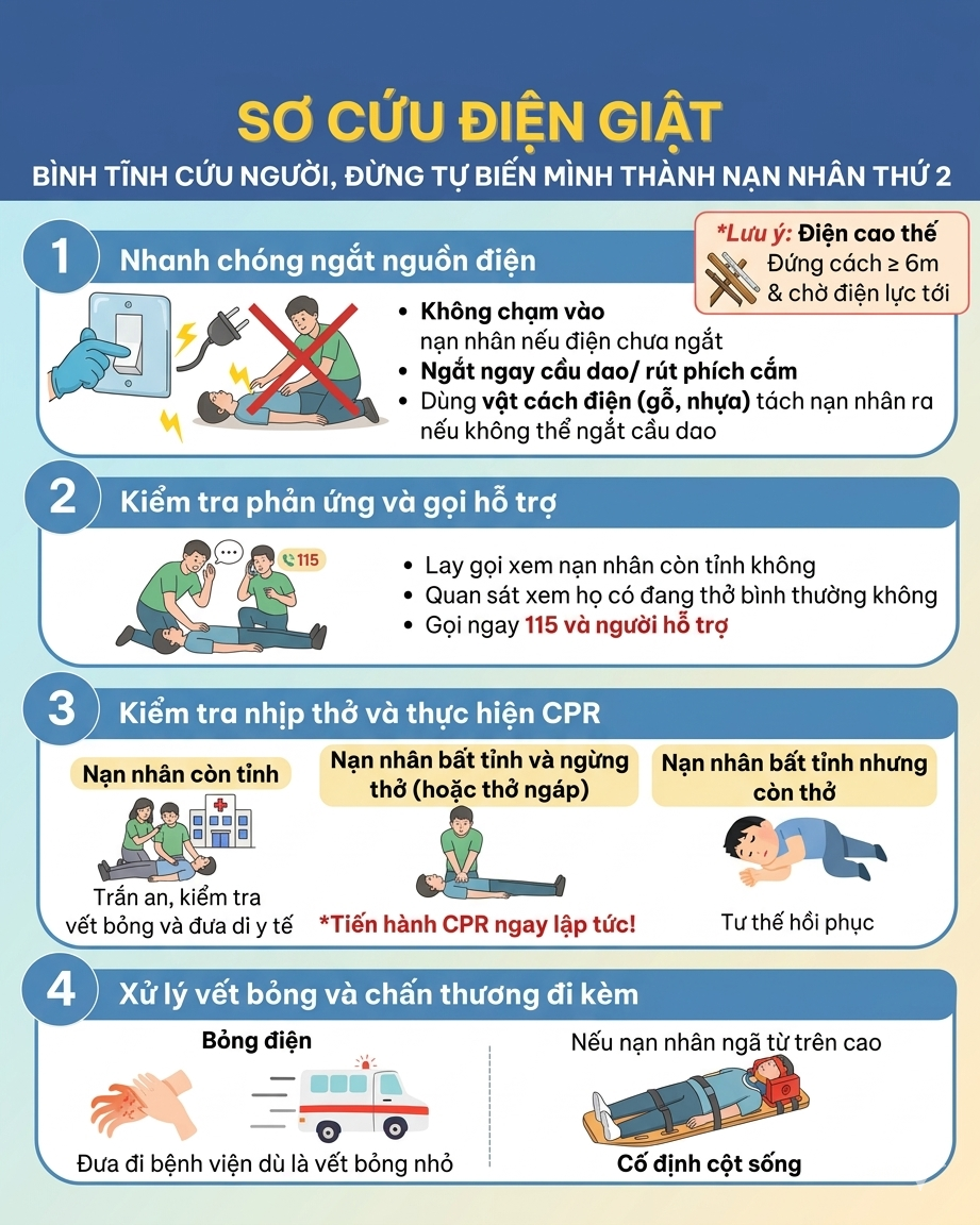 Để đảm bảo an toàn, việc sơ cứu điện giật cần được thực hiện đúng cách và theo trình tự.