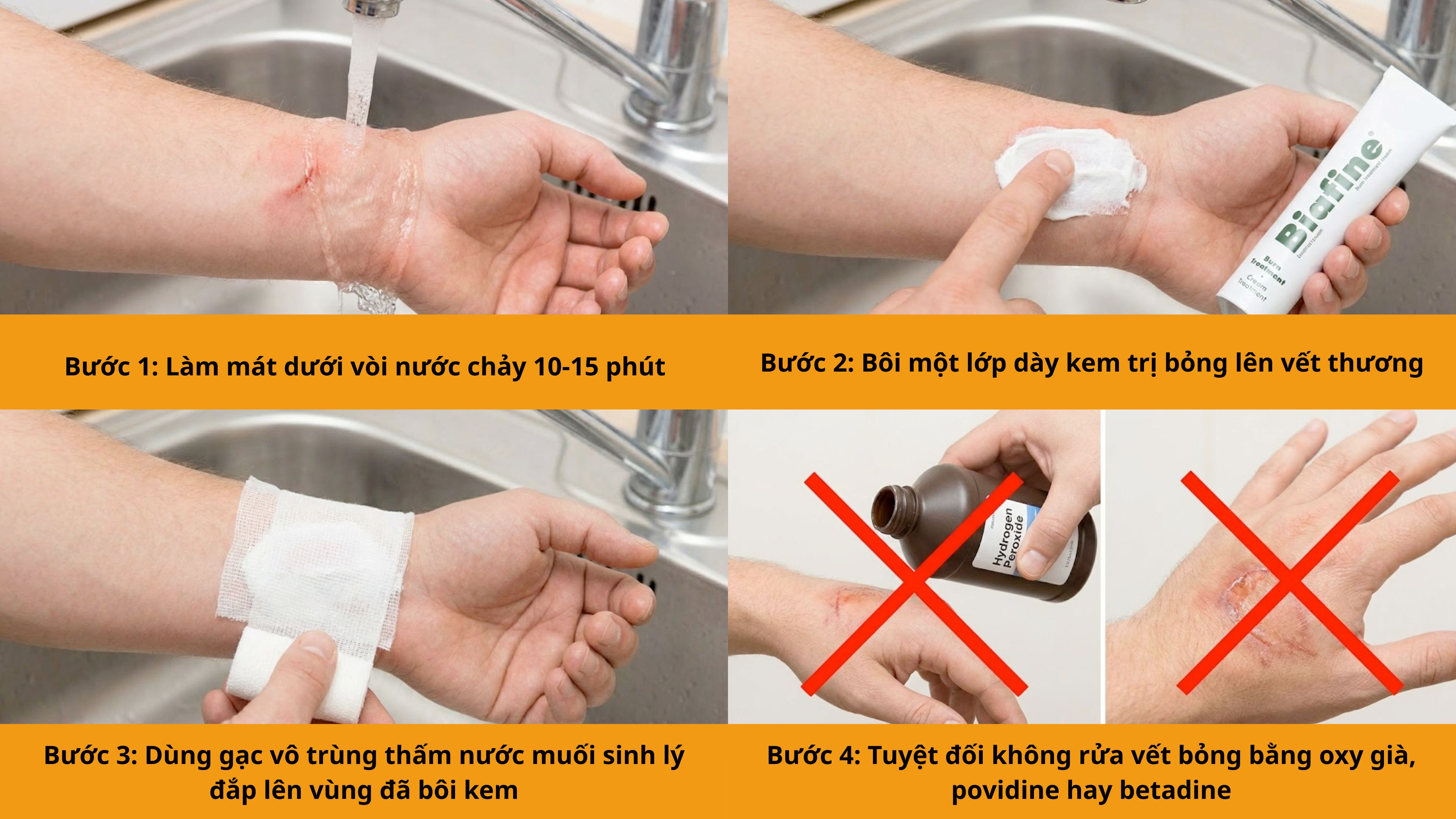 Ngay khi tai nạn bỏng xảy ra, điều quan trọng nhất là bình tĩnh và xử trí đúng trong những phút đầu tiên. Theo hướng dẫn của BS.CK2 Nguyễn Xuân Anh, các bước sơ cứu cần được thực hiện khẩn cấp và tuần tự như sau: