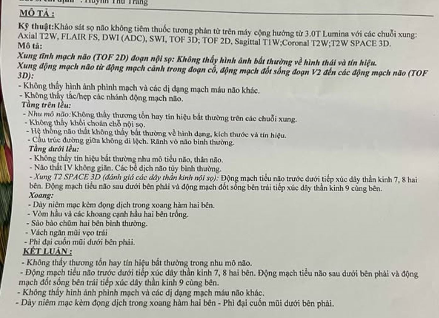 Em 21 tuổi, đau đầu, đã được chụp MRI não không ghi nhận tổn thương nhu mô não, không có u, không có xuất huyết hay dị dạng mạch máu. Kết quả này là rất yên tâm, loại trừ được nhiều nguyên nhân nguy hiểm.