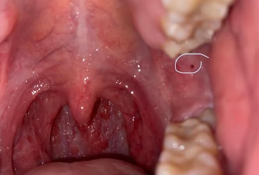 Theo như hình ảnh bạn gửi ở vùng họng miệng cho thấy bạn đang có tình trạng viêm họng cấp bởi vì sự sưng nề của các cấu trúc lympho hầu họng. Khi viêm cấp những cấu trúc mạch máu dưới niêm mạc sẽ có hiện tượng tăng sinh, đôi khi có đốm xuất huyết nhỏ như bạn đã thấy trên hình là điều hoàn toàn bình thường. Bạn hãy đến bệnh viện tai mũi họng để được bác sĩ trực tiếp thăm khám và kê toa kháng sinh điều trị cho bạn nhé. Các cấu trúc này không phải là tổn thương ác tính nên bạn không cần phải quá lo lắng.