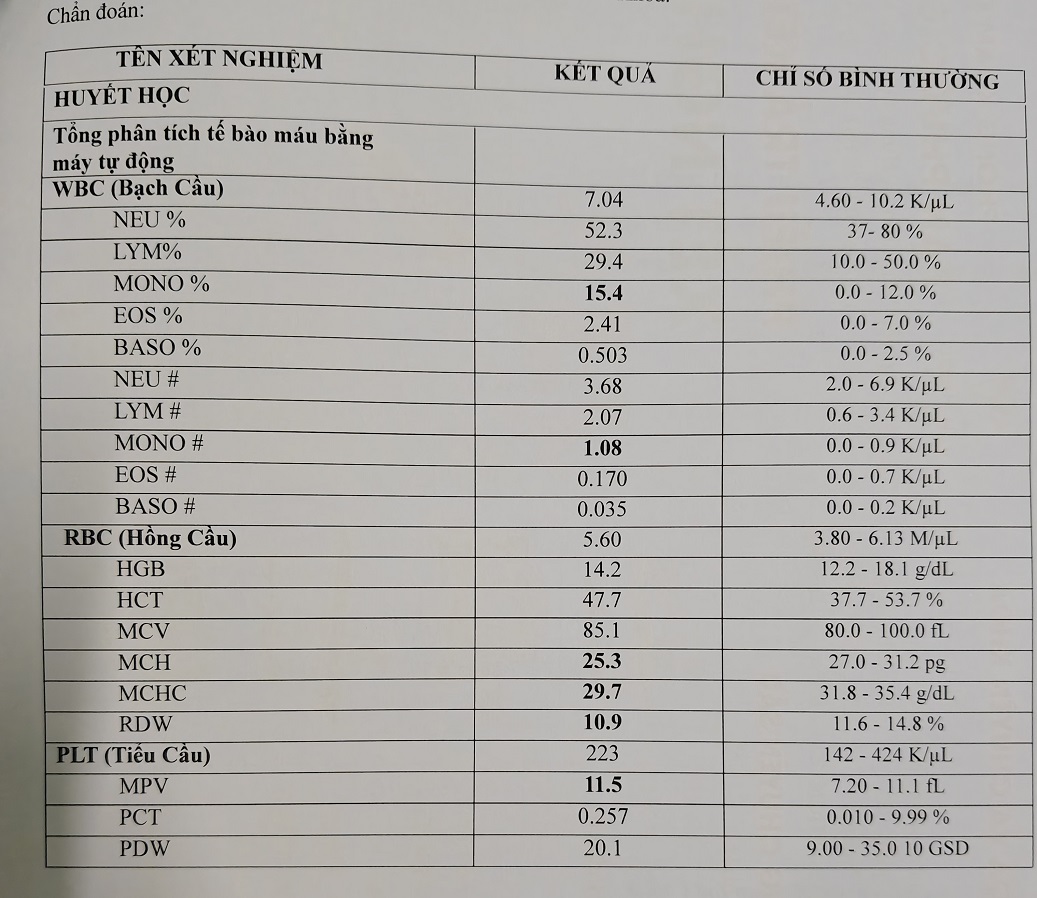 Xin hỏi bác sĩ. Kết quả xét nghiệm máu của tôi có vấn đề gì không? Có cần phải xét nghiệm chuyên sâu gì thêm không? Cảm ơn bác sĩ!