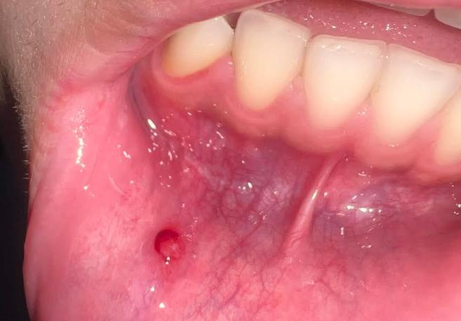 BS cho em hỏi, nốt đỏ này ở bên trong môi là bệnh gì, có phải sùi mào gà không ạ?