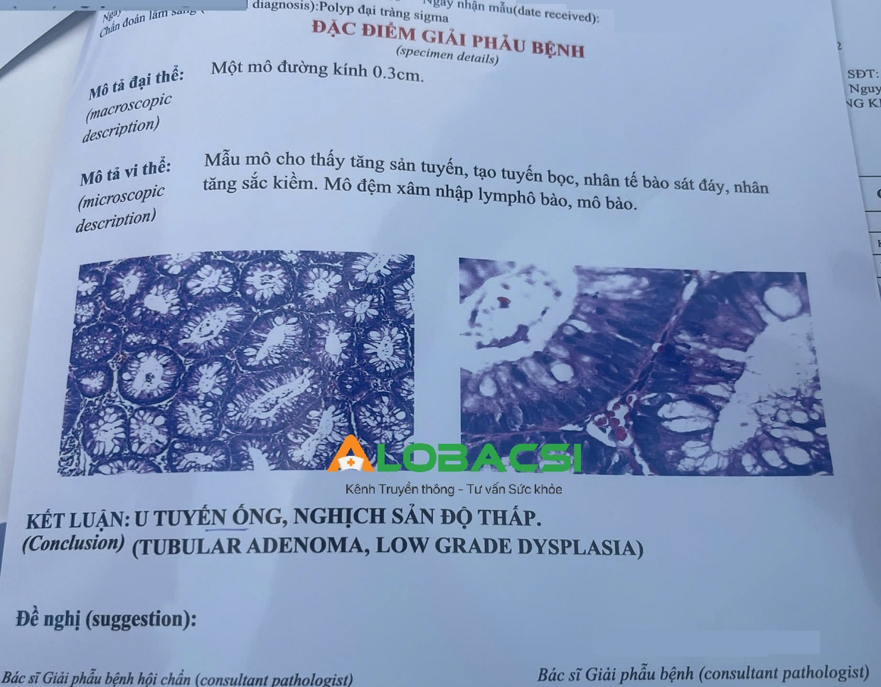 Xem qua kết quả giải phẫu bệnh bạn gửi, kết luận ghi nhận: u tuyến ống, nghịch sản độ thấp. Đây là một dạng polyp tuyến của đại tràng, thuộc nhóm tổn thương lành tính, chưa phải là ung thư.