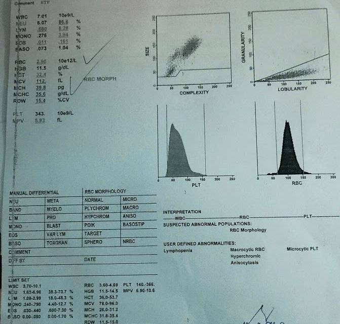 Kết quả xét nghiệm kiểm tra công thức máu của bệnh nhân ghi nhận tình trạng thiếu máu mức độ nhẹ, hình thái hồng cầu to và ưu sắc, nguyên nhân thường gặp trong thiếu vitamin B12 và acid folic, bia rượu, bệnh máu di truyền…