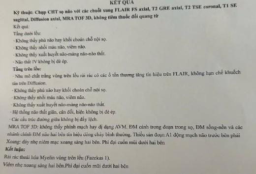 1. Kết quả MRI và MRA (chụp mạch máu não) rất tốt, không thấy khối choán chỗ, xuất huyết hay nhồi máu não. Không có dị dạng mạch máu não (AVM), không hẹp hay tắc mạch.