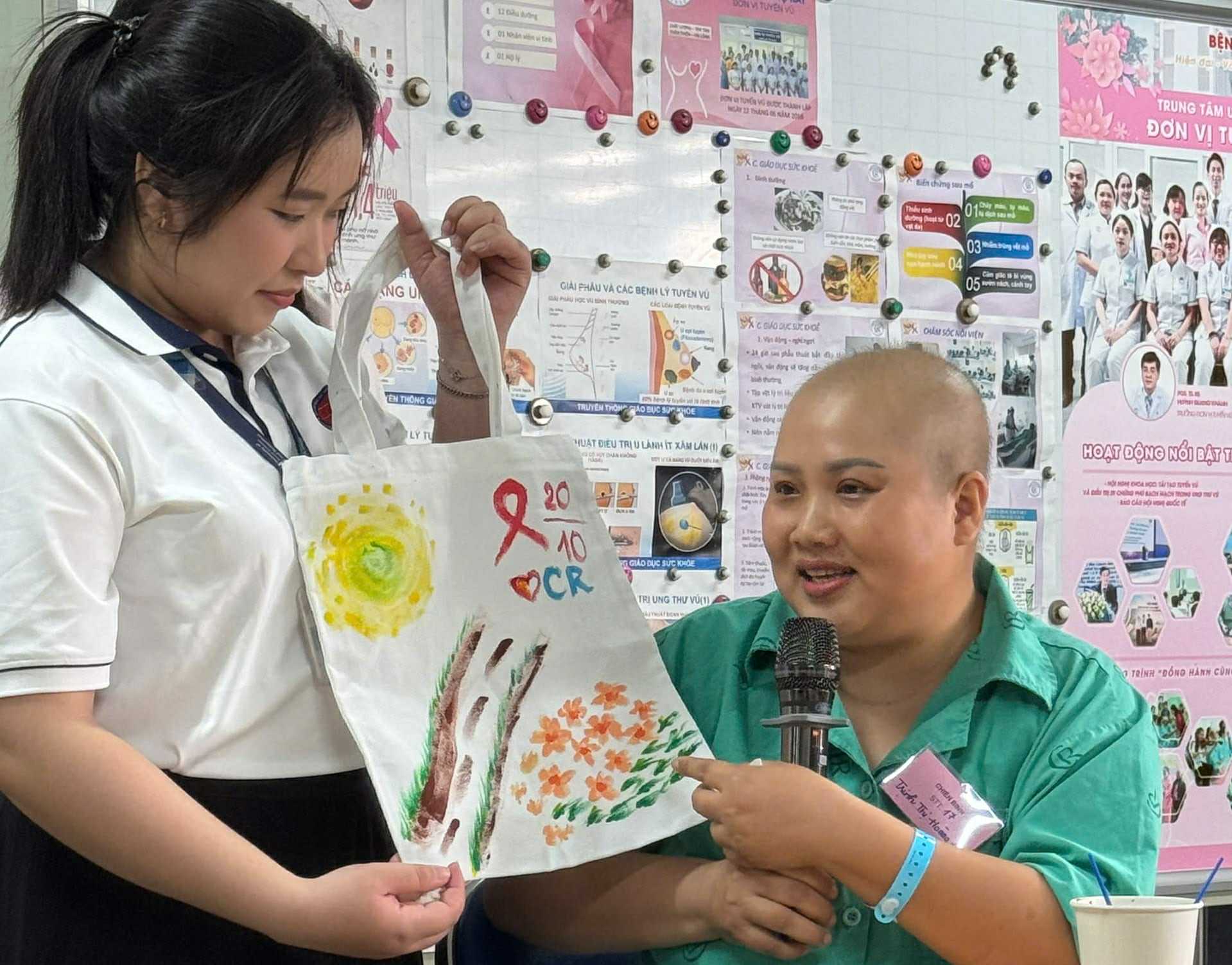 Ngày 17/10, tại Khu sinh hoạt người bệnh - Khoa Tuyến vú, chương trình giao lưu đầu tiên đã diễn ra trong không khí ấm áp, chan hòa yêu thương. Các bệnh nhân - những người phụ nữ đang điều trị ung thư - cùng nhau vẽ tranh canvas trên túi, thả hồn vào màu sắc để kể lại câu chuyện của chính mình.