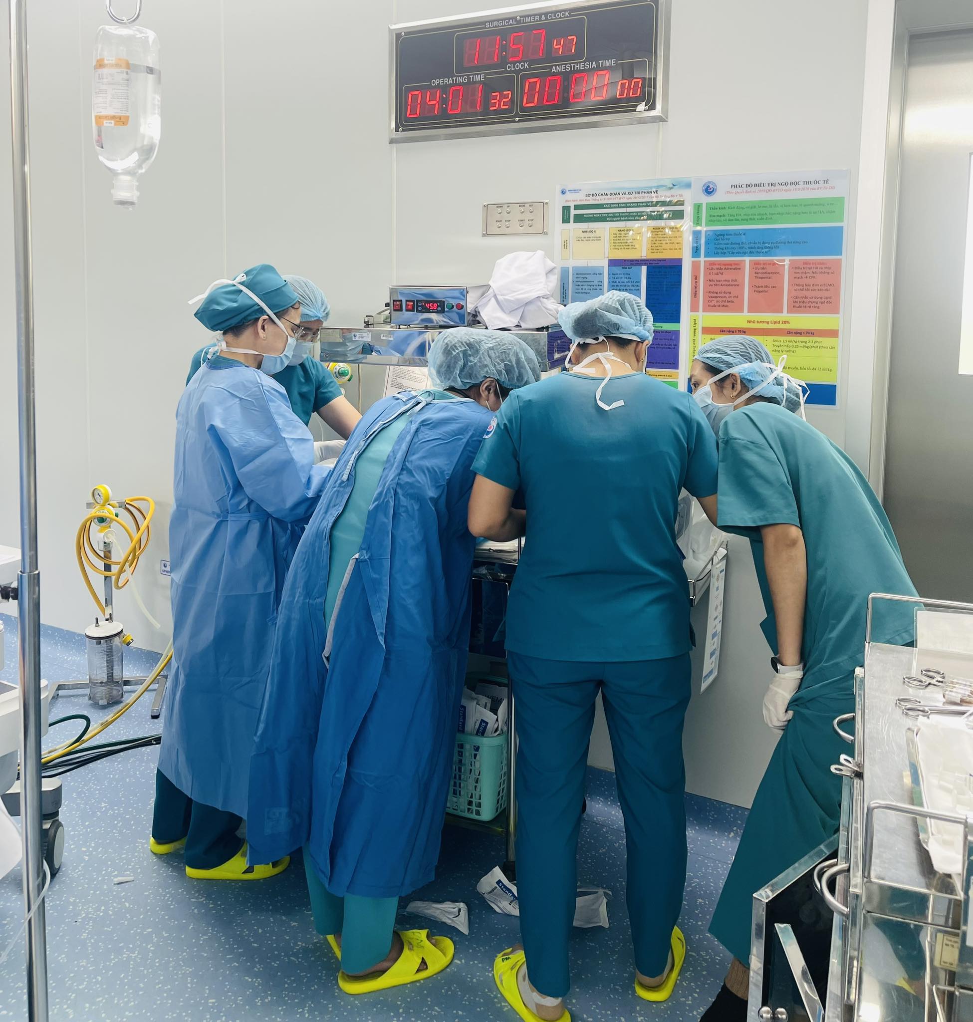 Phòng mổ được báo động sẵn sàng trong thời gian ngắn nhất, với đầy đủ bác sĩ sản khoa, gây mê, điều dưỡng và ê-kíp sơ sinh. Ca mổ được tiến hành khẩn trương nhằm đưa thai nhi ra ngoài càng sớm càng tốt.