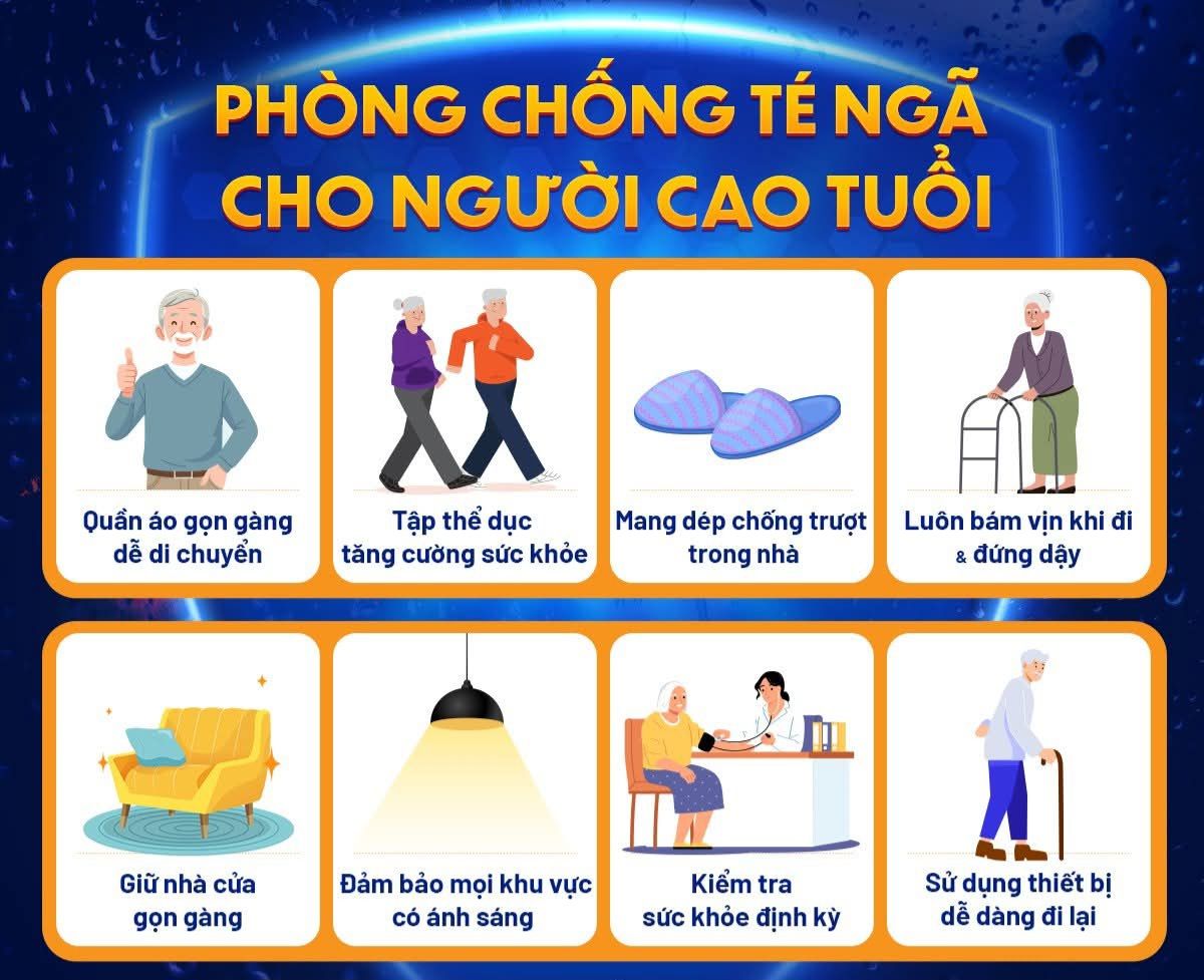 Các chuyên gia khuyến cáo, để phòng ngừa té ngã, gia đình nên giữ nhà cửa gọn gàng, lắp tay vịn tại khu vực dễ trơn trượt, đồng thời trang bị giày dép chống trơn, dụng cụ hỗ trợ đi lại như gậy hoặc nạng cho người cao tuổi. Người già cũng cần duy trì vận động nhẹ nhàng, bổ sung canxi, vitamin D và khám sức khỏe định kỳ để tầm soát loãng xương.