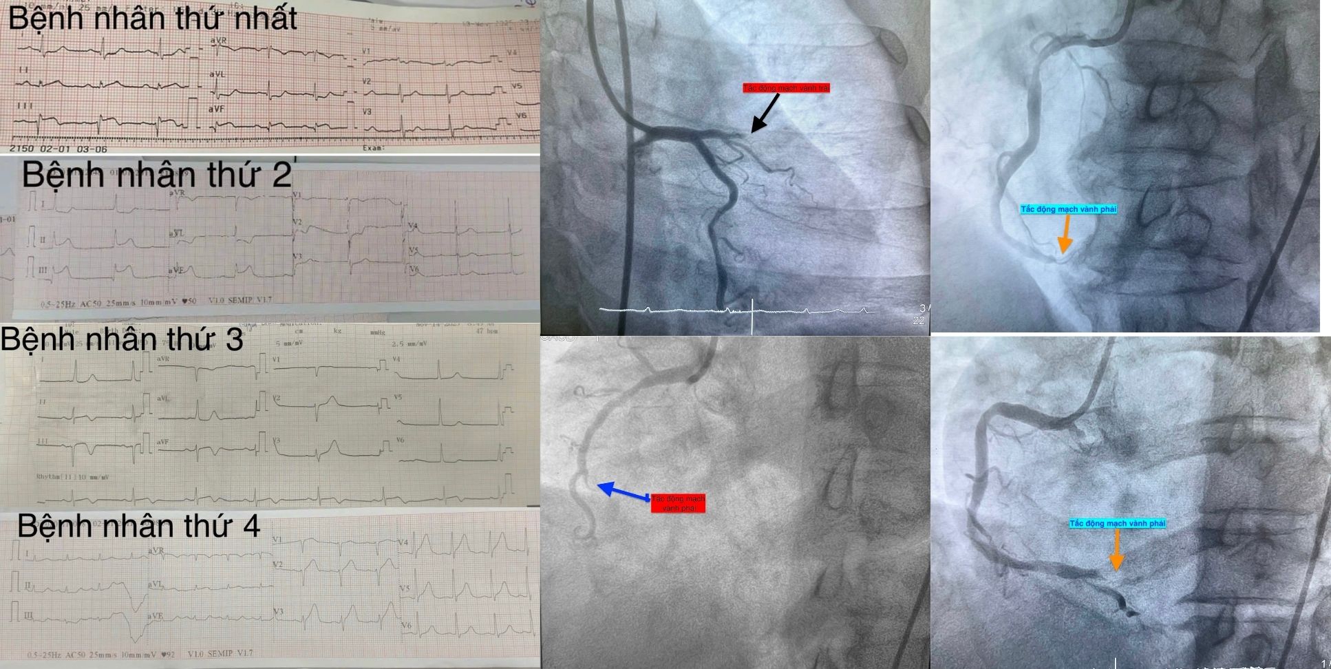 Trường hợp thứ tư là bệnh nhân nữ, 61 tuổi, mắc đái tháo đường type 2, đau ngực điển hình kèm vã mồ hôi. Điện tim chẩn đoán nhồi máu cơ tim cấp thành trước. Can thiệp tái thông động mạch thủ phạm thành công.