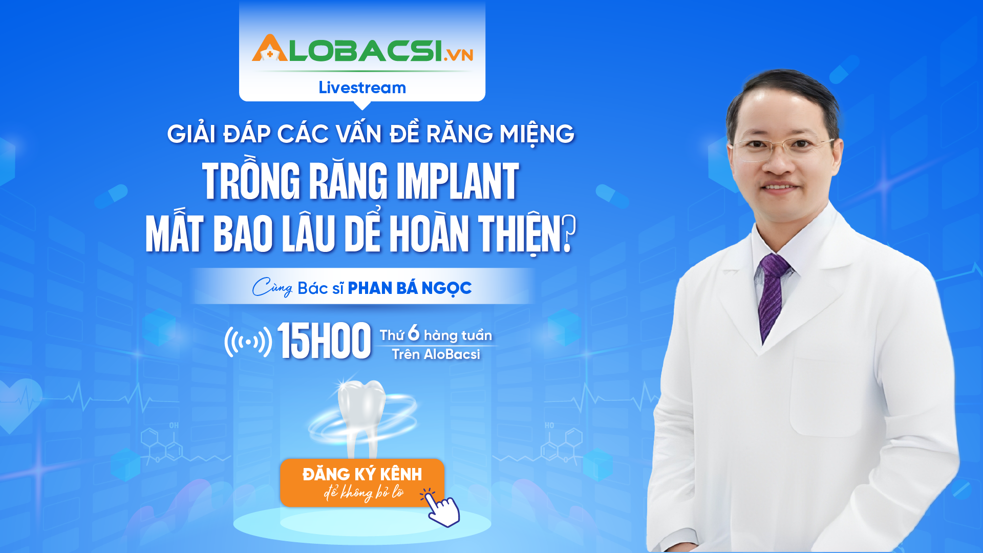 Những thắc mắc này sẽ được BS.CK1 Phan Bá Ngọc - Giám đốc Phòng khám Nha khoa Hạnh Phúc phân tích và giải đáp trong livestream giải đáp các vấn đề răng miệng kỳ 13, với chủ đề “Trồng răng Implant mất bao lâu để hoàn thiện?”, phát sóng lúc 15h00 chiều thứ 6, ngày 6/2/2026 trên các kênh của AloBacsi (YouTube/ website/ fanpage/ Zalo OA) và Fanpage Phòng khám Nha khoa Hạnh Phúc.