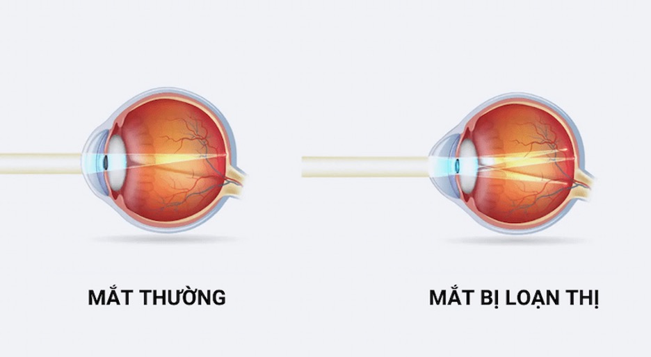 Định nghĩa: Loạn thị (tên khoa học: Astigmatism) là một tật khúc xạ xảy ra khi giác mạc (lòng đen) hoặc thủy tinh thể có hình dạng cong không đều, giống như quả bóng bầu dục thay vì hình cầu tròn hoàn hảo. Điều này khiến các tia sáng khi đi vào mắt không hội tụ tại một điểm duy nhất trên võng mạc, dẫn đến hình ảnh bị mờ, nhòe và biến dạng ở mọi khoảng cách.
