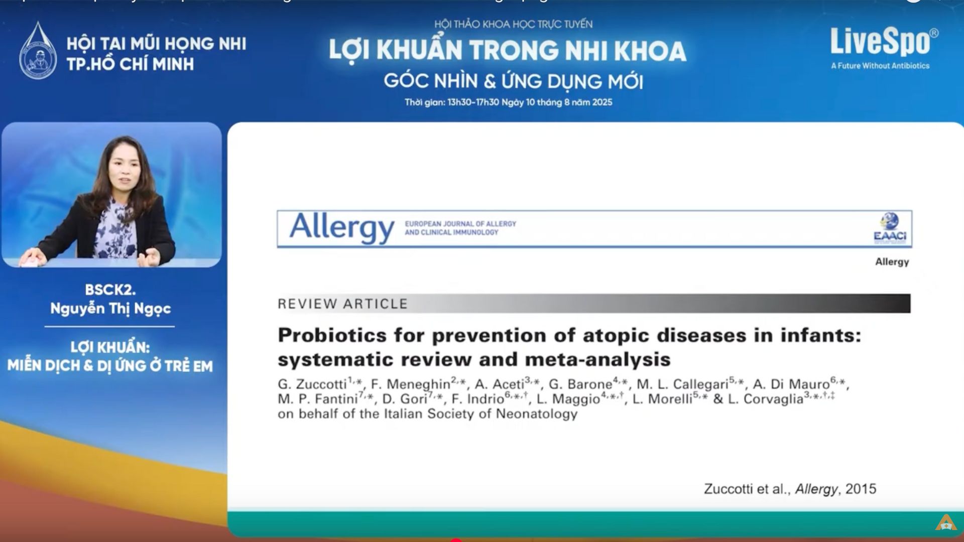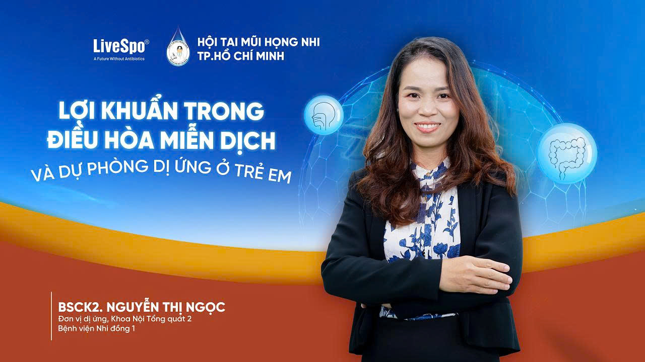 Tại Hội thảo khoa học trực tuyến “Lợi khuẩn trong nhi khoa: Góc nhìn và ứng dụng mới” do Hội Tai Mũi Họng Nhi TPHCM tổ chức ngày 10/8/2025, BS.CK2 Nguyễn Thị Ngọc - Đơn vị Dị ứng, Khoa Nội Tổng quát 2 - Hô hấp, Bệnh viện Nhi Đồng 1 đã cập nhật cơ chế bệnh sinh và bằng chứng mới về vai trò của probiotic trong phòng ngừa, hỗ trợ điều trị dị ứng ở trẻ.