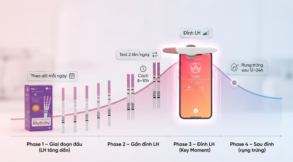 - Ở giai đoạn đầu, sẽ sử dụng que thử MyBaby ngay sau khi sạch kinh để giúp theo dõi nhịp tăng dần của hormone LH. Việc theo dõi liên tục mỗi ngày sẽ giúp giảm áp lực tài chính mà vẫn nắm bắt được những dấu hiệu của cơ thể.