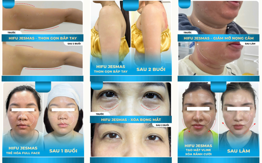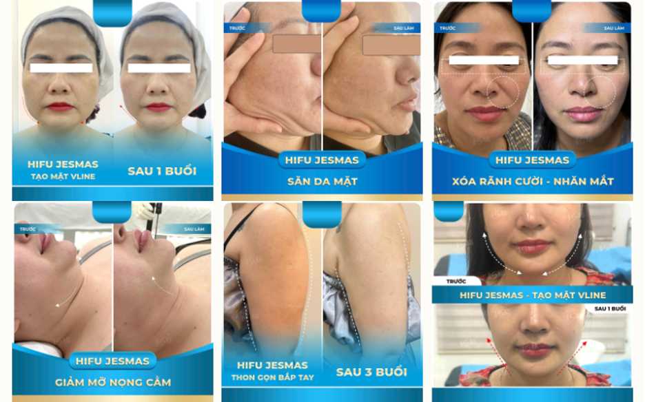 Trong thực tế điều trị, máy HIFU Jesmas có thể mang lại những lợi ích rõ rệt như nâng cơ, định hình gương mặt V-line, phù hợp cho khách có nọng cằm, chảy xệ vùng hàm. Xóa nhăn, trẻ hóa da: giảm nếp nhăn trán, rãnh cười, vết chân chim, da chùng quanh mắt. Cải thiện da chùng sau sinh/giảm cân: vùng bụng, bắp tay, đùi. Giảm mỡ cục bộ, hỗ trợ giảm mỡ vùng khó tập luyện như nọng cằm, bụng dưới. Đặc biệt, khách hàng có thể quay lại sinh hoạt ngay sau liệu trình.