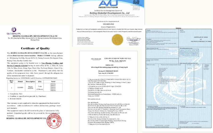 Máy HIFU Jesmas US360D là một trong số ít thiết bị đã được cấp phép lưu hành chính thức tại Việt Nam, đi kèm các chứng nhận quốc tế quan trọng: