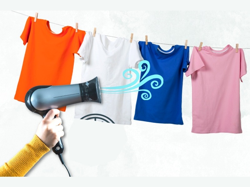 Chỉ cần điều chỉnh nhiệt độ ở mức vừa phải, đưa luồng gió đến gần quần áo ẩm, người dùng có thể làm khô nhanh những bộ đồ cần mặc gấp như áo đồng phục, sơ mi hay tất. Để hiệu quả hơn, nên kết hợp với quạt hoặc treo đồ ở nơi thoáng khí.
