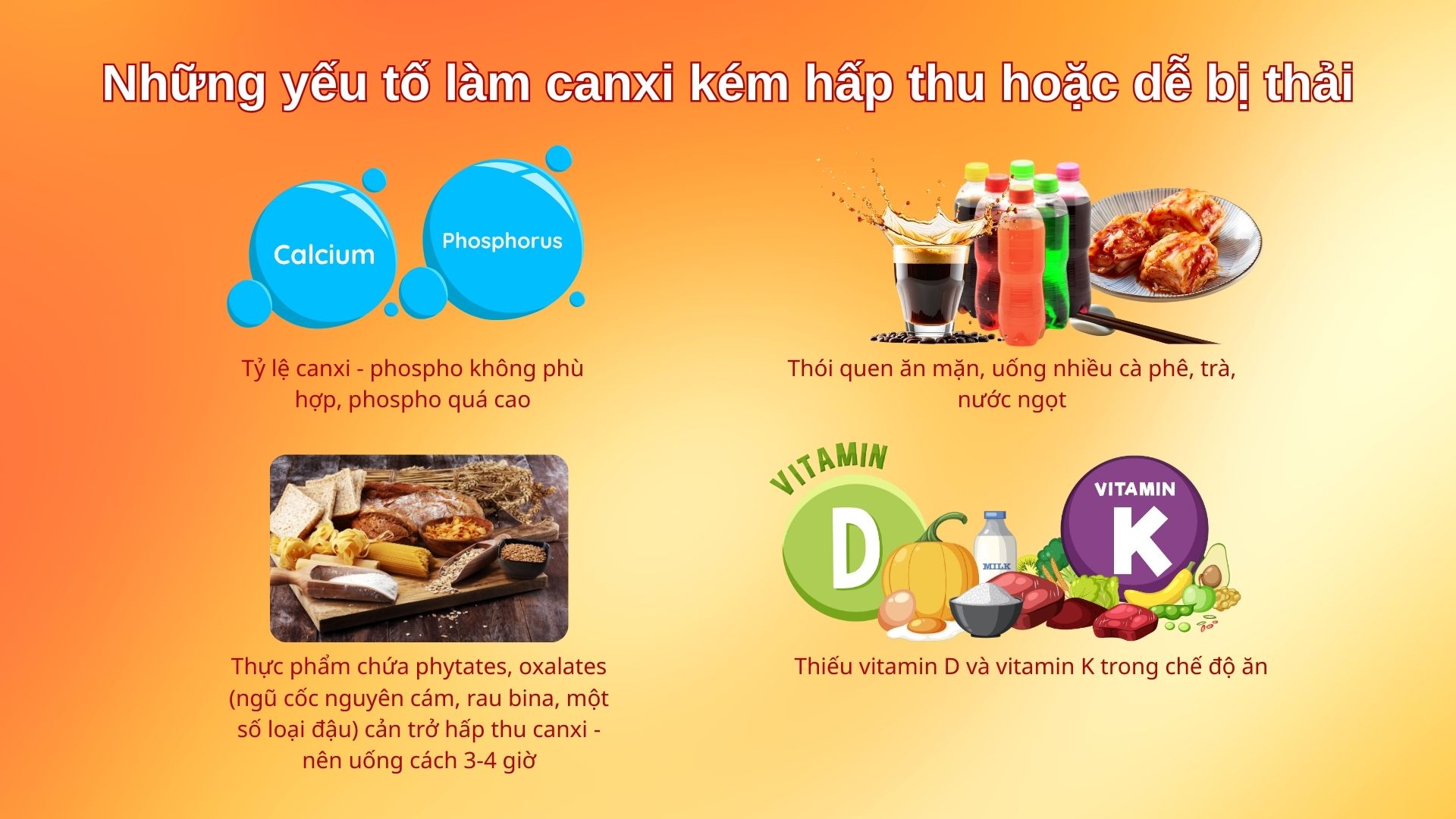 Ngoài ra, một số thực phẩm và thói quen ăn uống có thể gây tương tác, làm cản trở quá trình hấp thu canxi. Các yếu tố thường gặp bao gồm ăn mặn, uống nhiều cà phê, trà, nước ngọt. Một số loại rau và thực phẩm chứa phytates hoặc oxalates có thể kết hợp với canxi tạo thành phức hợp không hòa tan, khiến canxi không thể được hấp thu.