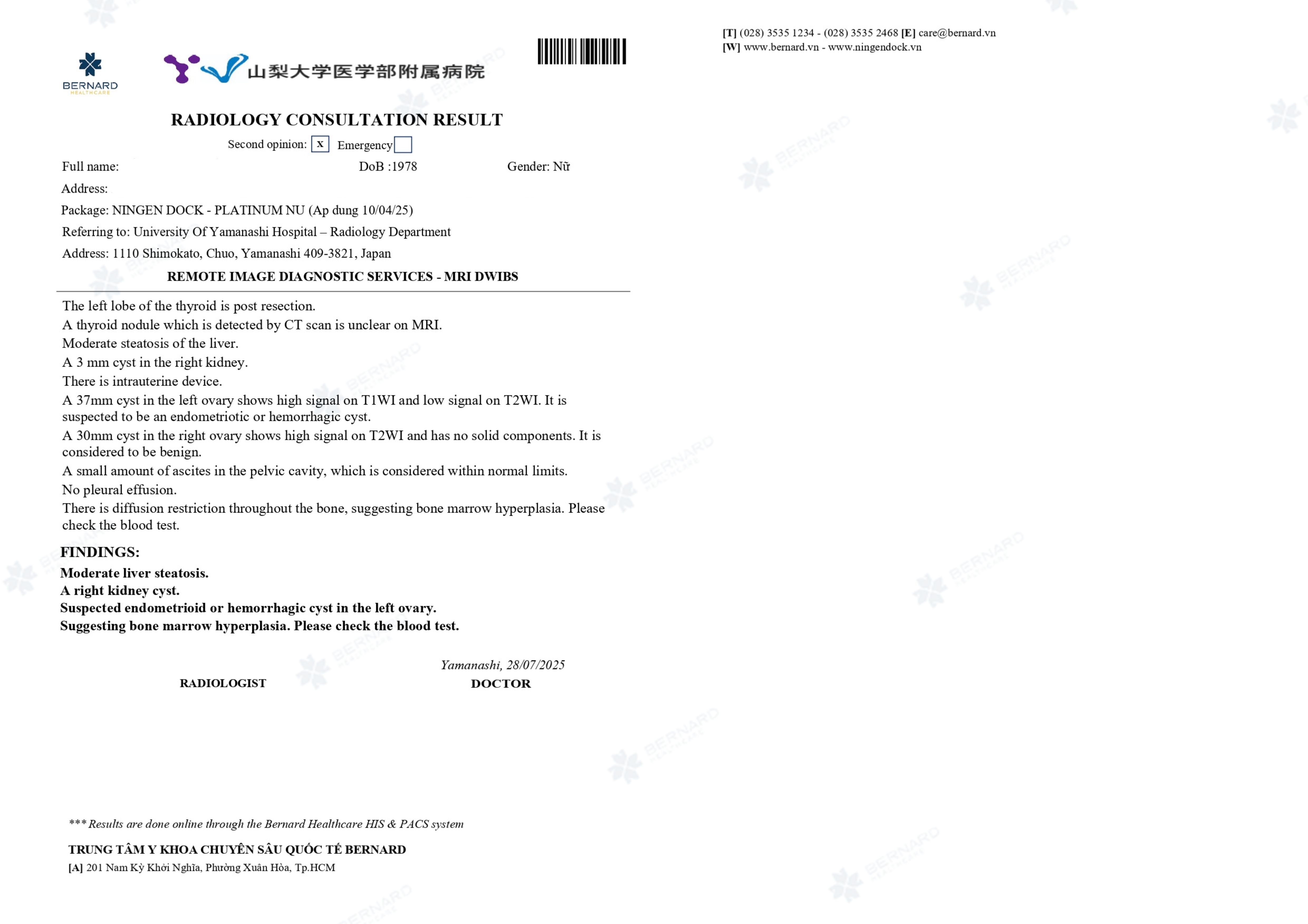 Theo quy trình Ningen Dock chuẩn Nhật, toàn bộ hình ảnh MRI của chị được kiểm tra chéo bởi chuyên gia Bệnh viện Đại học Yamanashi (Nhật Bản). Báo cáo phản hồi đồng thuận với nhận định ban đầu và khuyến nghị bệnh nhân tiếp tục được đánh giá bởi chuyên khoa huyết học để làm rõ nguyên nhân.