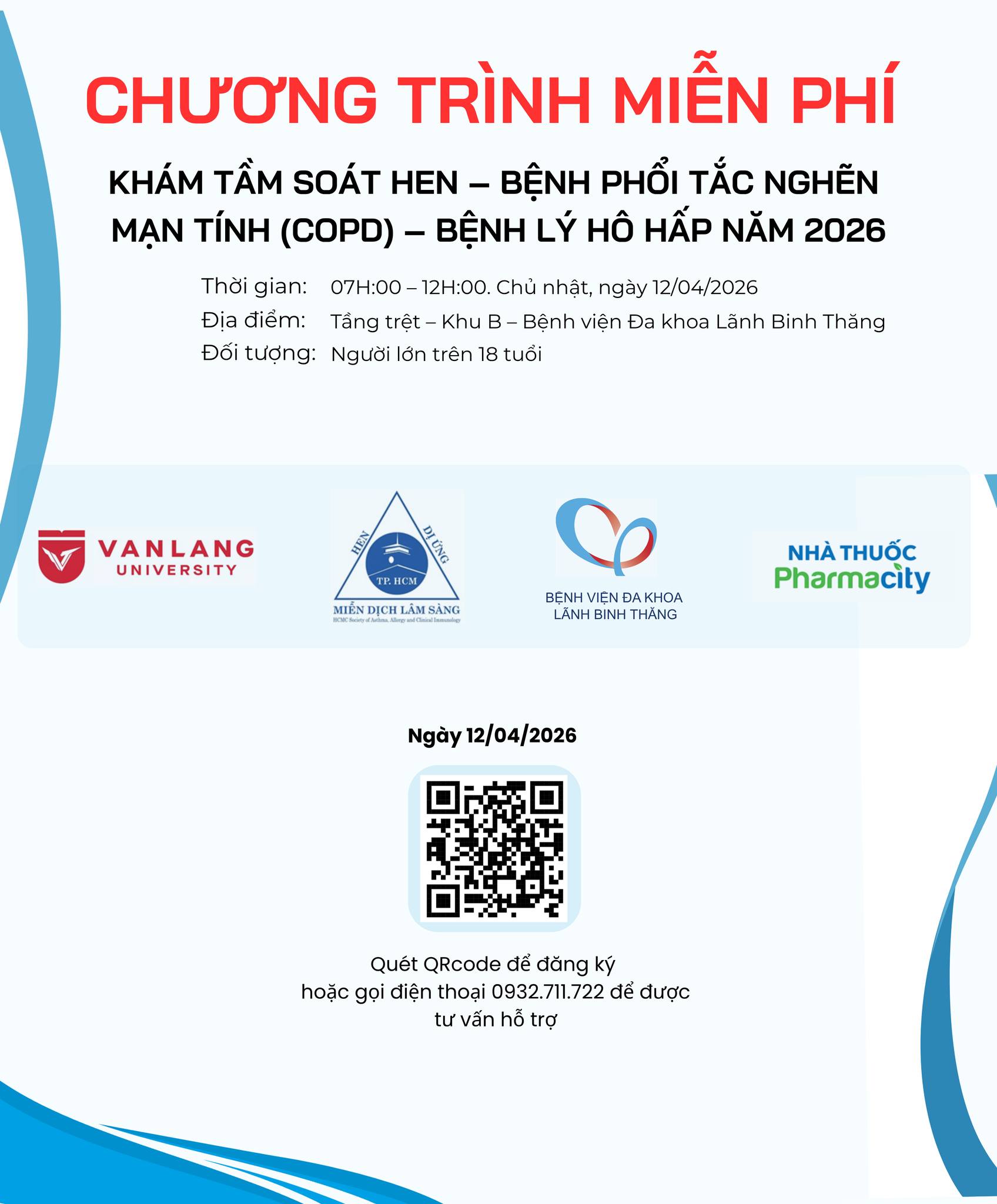 Chương trình diễn ra từ 7h đến 12h, Chủ nhật ngày 12/4/2026 tại Bệnh viện Đa khoa Lãnh Binh Thăng (TPHCM). Người dân có thể đăng ký tham gia miễn phí, số lượng có hạn.