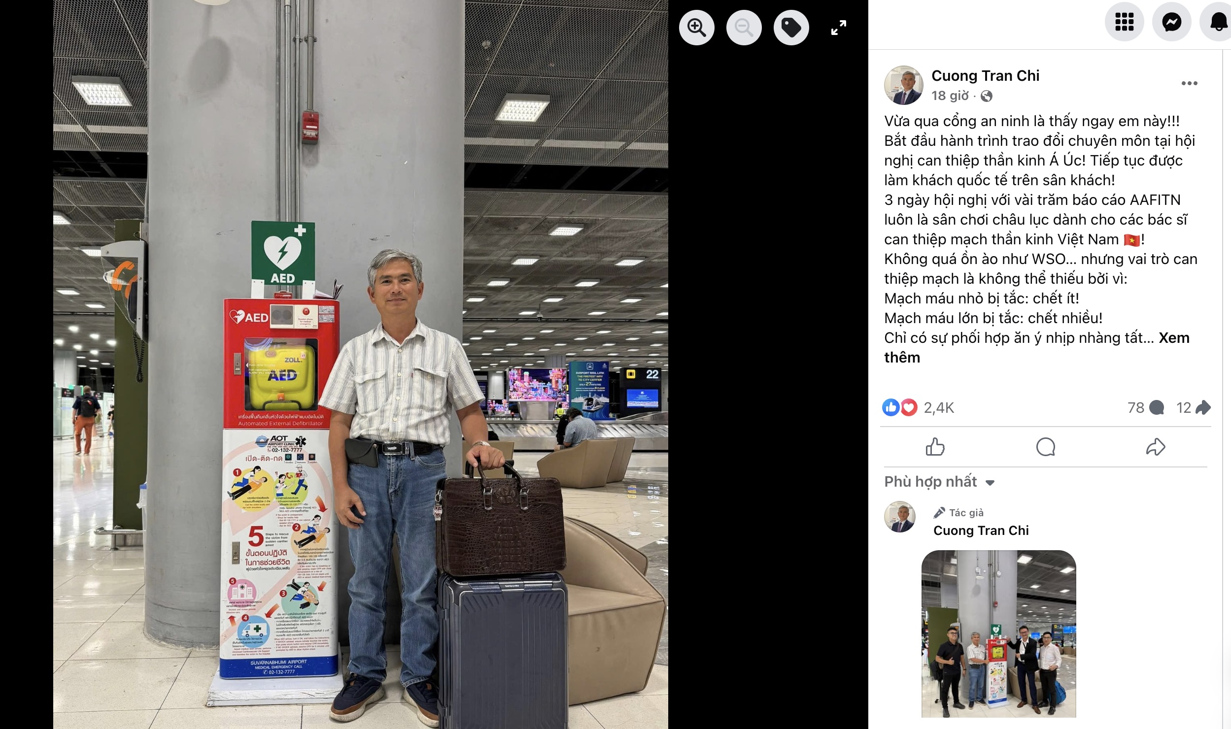 Một buổi chiều tại sân bay Suvarnabhumi (Bangkok, Thái Lan), khi đoàn bác sĩ Bệnh viện Đa khoa Quốc tế S.I.S Cần Thơ làm thủ tục nhập cảnh để đến dự Đại hội lần thứ 16 của Liên đoàn Thần kinh Can thiệp và Trị liệu Á - Úc (AAFITN 2025), TS.BS Trần Chí Cường - Giám đốc bệnh viện bất chợt dừng lại trước một chiếc máy nhỏ gắn ngay lối ra vào - máy khử rung tim ngoài tự động (AED).