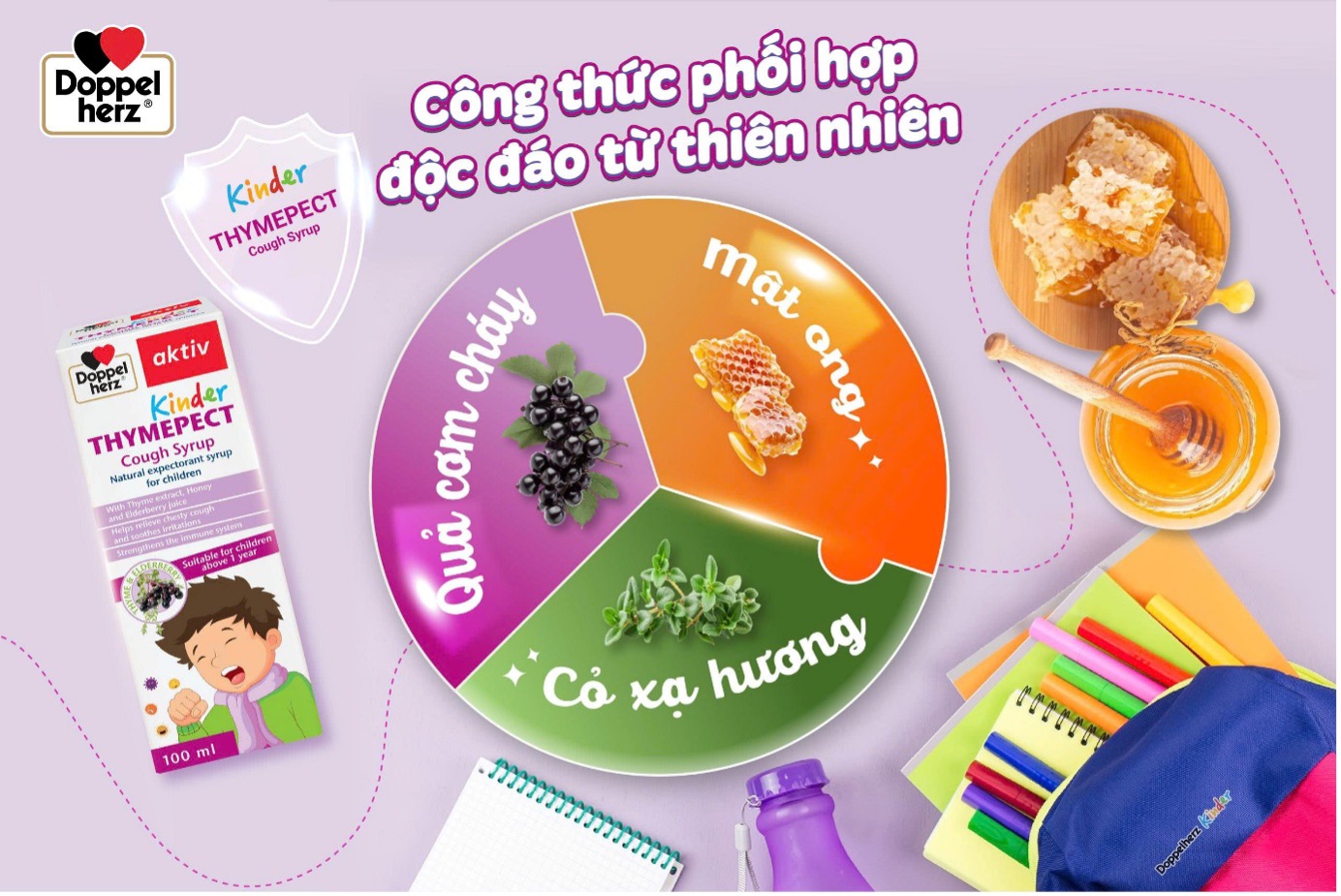 Với công thức từ thảo dược, Doppelherz Kinder Thymepect trở thành lựa chọn hỗ trợ phù hợp cho phụ huynh muốn giảm ho cho con một cách nhẹ nhàng, an toàn và “theo sinh lý”. Thymepect hỗ trợ giúp giảm ho có đờm và hỗ trợ giảm kích ứng đường hô hấp (ho khan), đồng thời hỗ trợ nâng cao sức đề kháng cho trẻ khi đang bị ho.