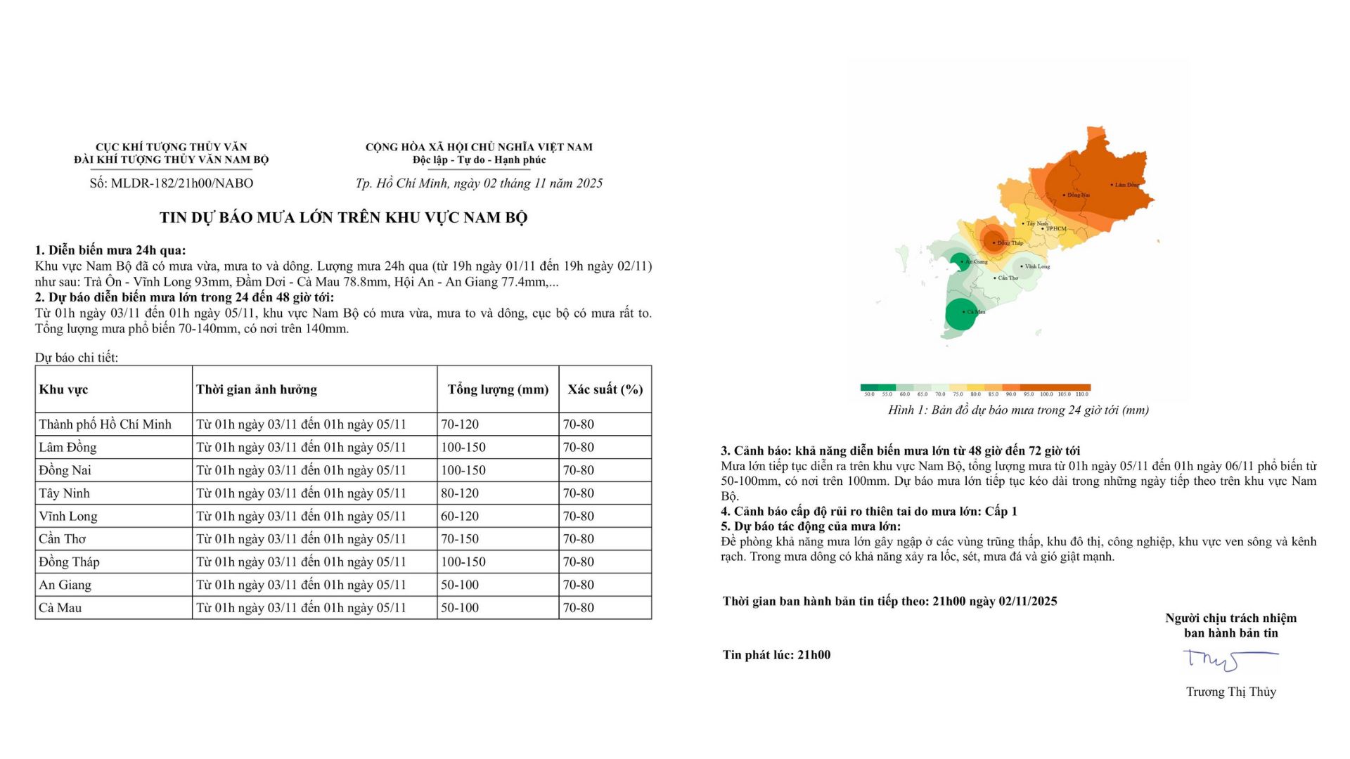 Theo Đài Khí tượng Thủy văn Nam Bộ, từ ngày 3/11 đến ngày 5/11, khu vực Nam Bộ sẽ có mưa vừa, mưa to và dông, cục bộ có nơi mưa rất to với tổng lượng mưa phổ biến từ 70-140mm, có nơi trên 140mm.