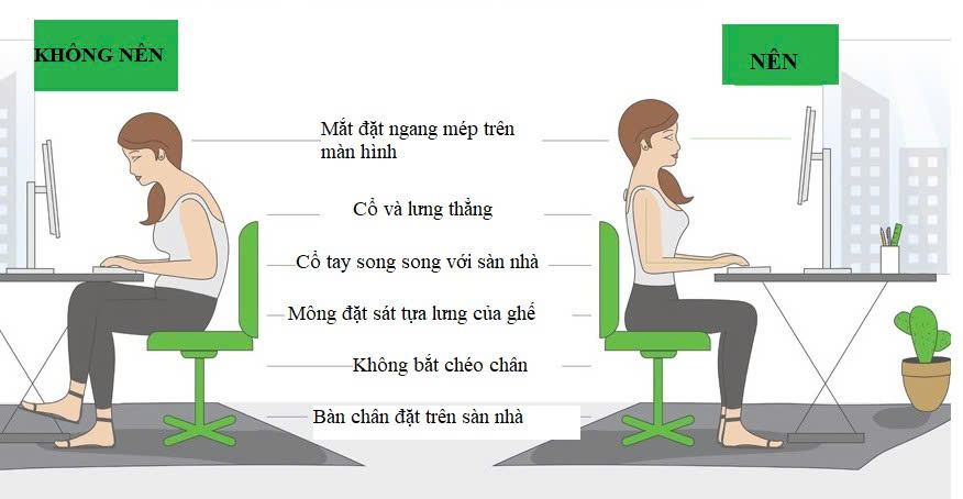 Cuối cùng là màn hình. Dù dùng máy tính bàn hay laptop, cần kê màn hình lên để tầm mắt ngang với 1/3 trên của màn hình. Với laptop, ít nhất mép trên của màn hình phải ngang tầm mắt để tránh cúi quá nhiều.