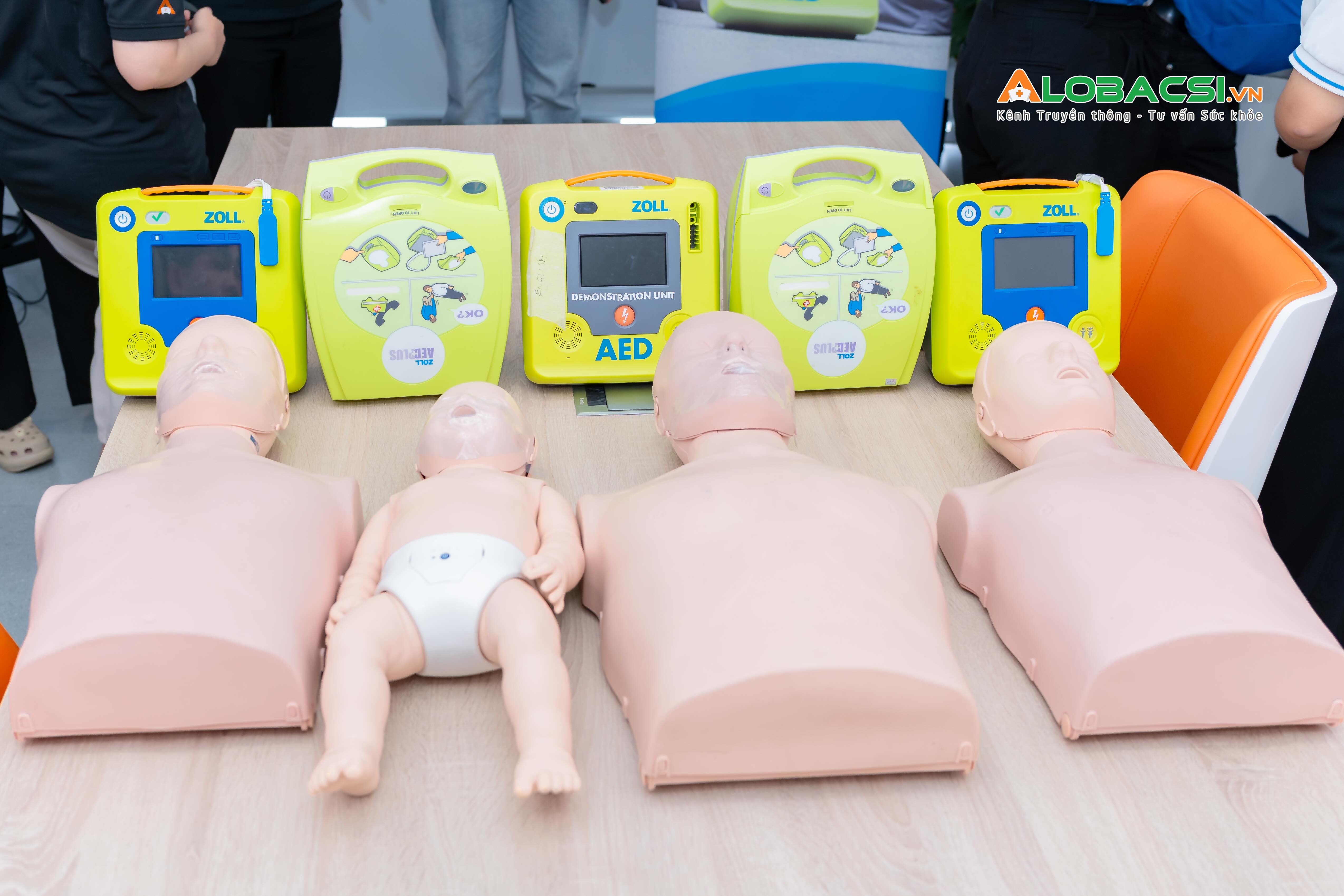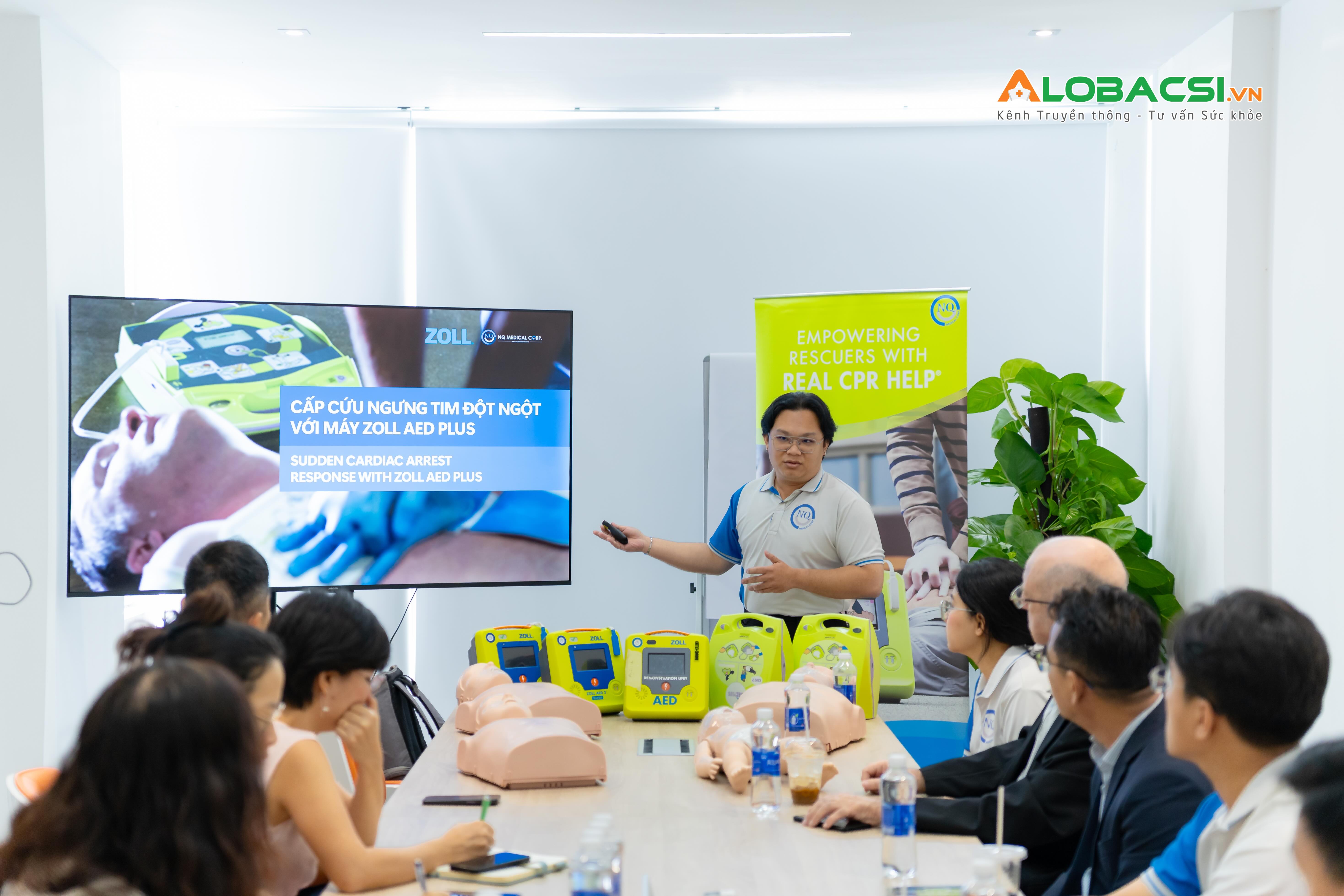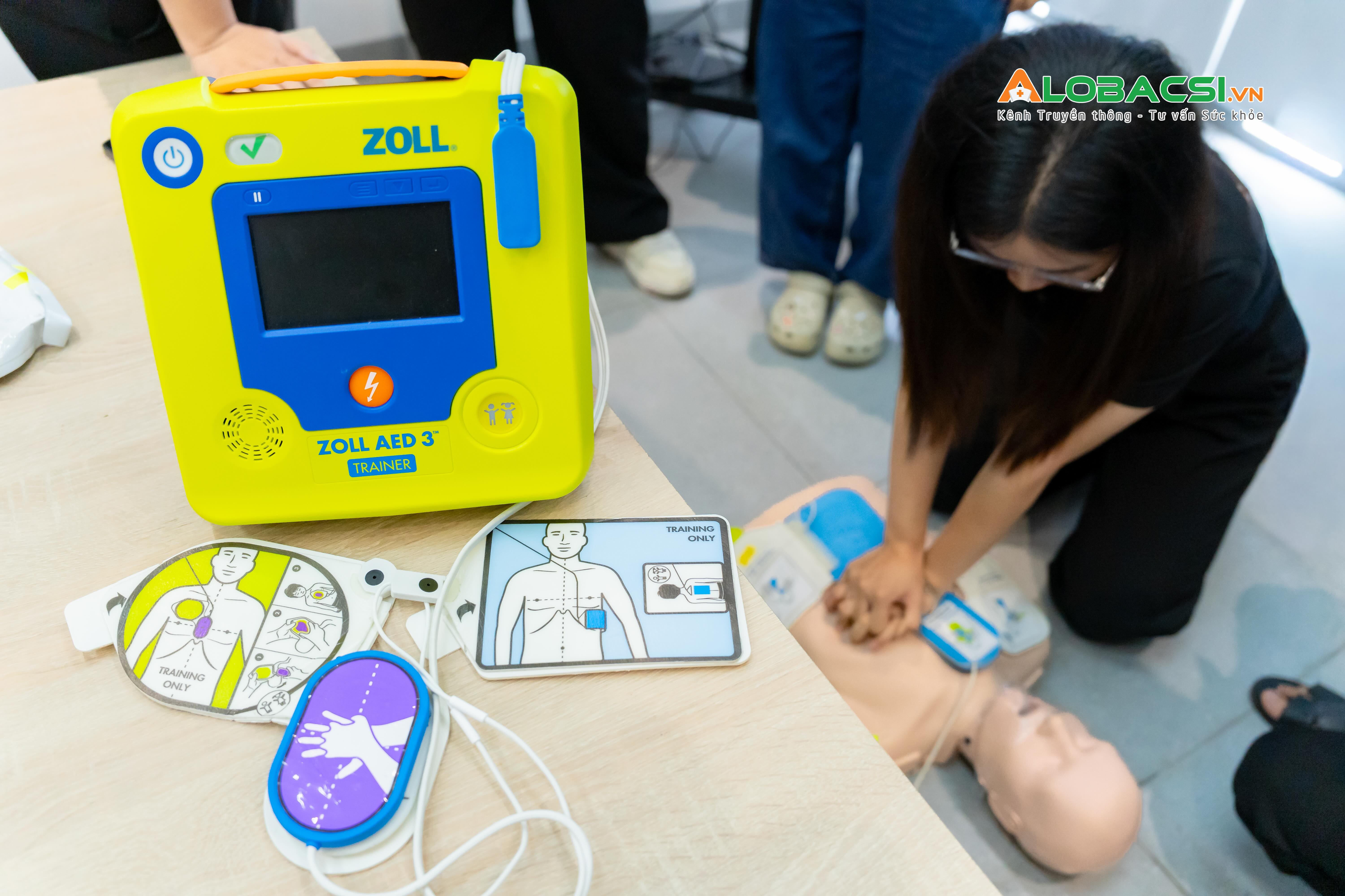 Hiểu rõ tầm quan trọng của “3-4 phút vàng”, AloBacsi đã phối hợp cùng Công ty Cổ phần Y Khoa NQ (NQ Medical Corp) tổ chức buổi tập huấn nội bộ về kỹ năng sơ cấp cứu ngừng tim. Chương trình được thiết kế dựa trên hướng dẫn của AHA, tập trung thực hành hồi sức tim phổi (CPR) và sử dụng máy sốc tim ngoài tự động ZOLL AED Plus - thiết bị có khả năng phản hồi lực ép và tần suất theo thời gian thực.