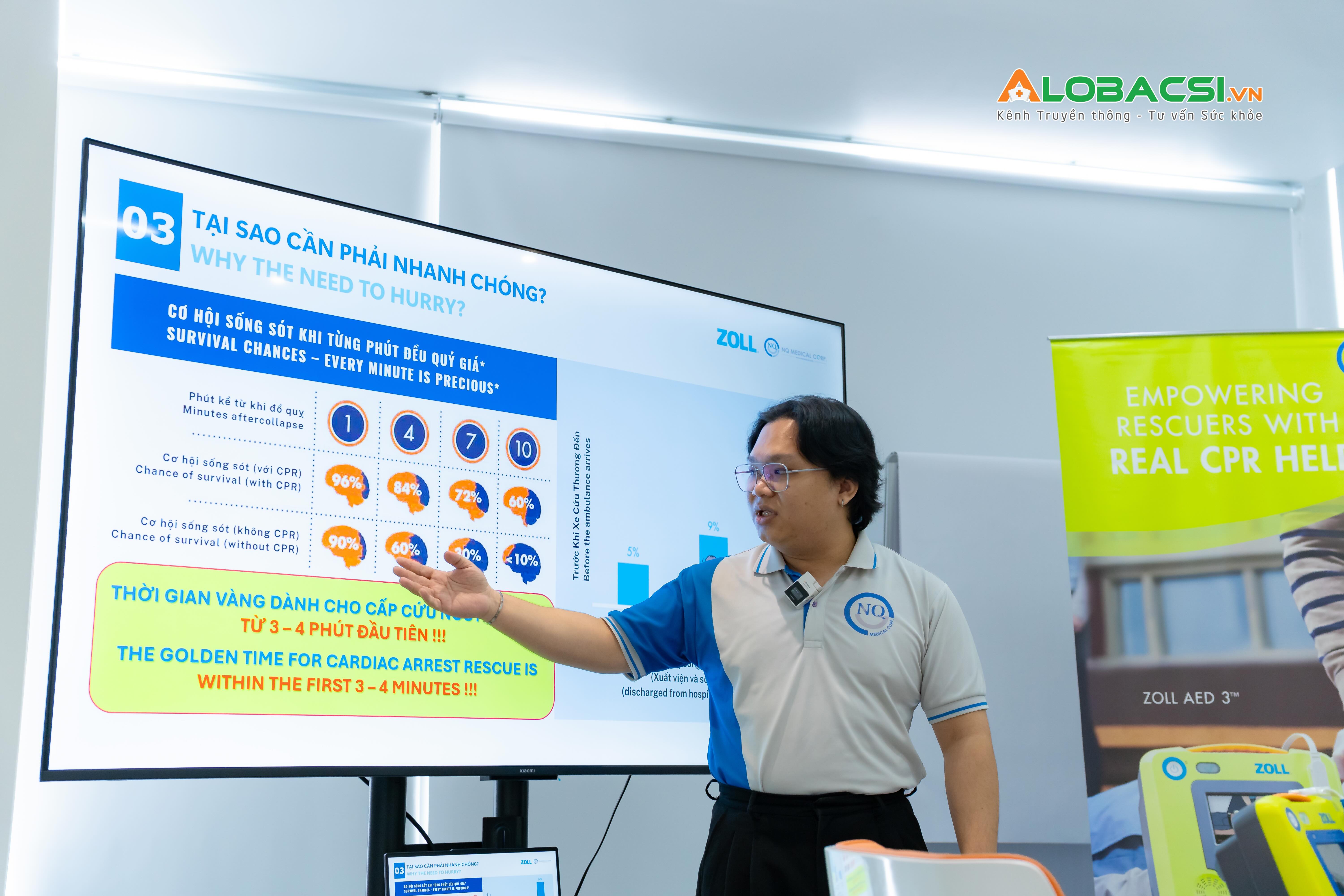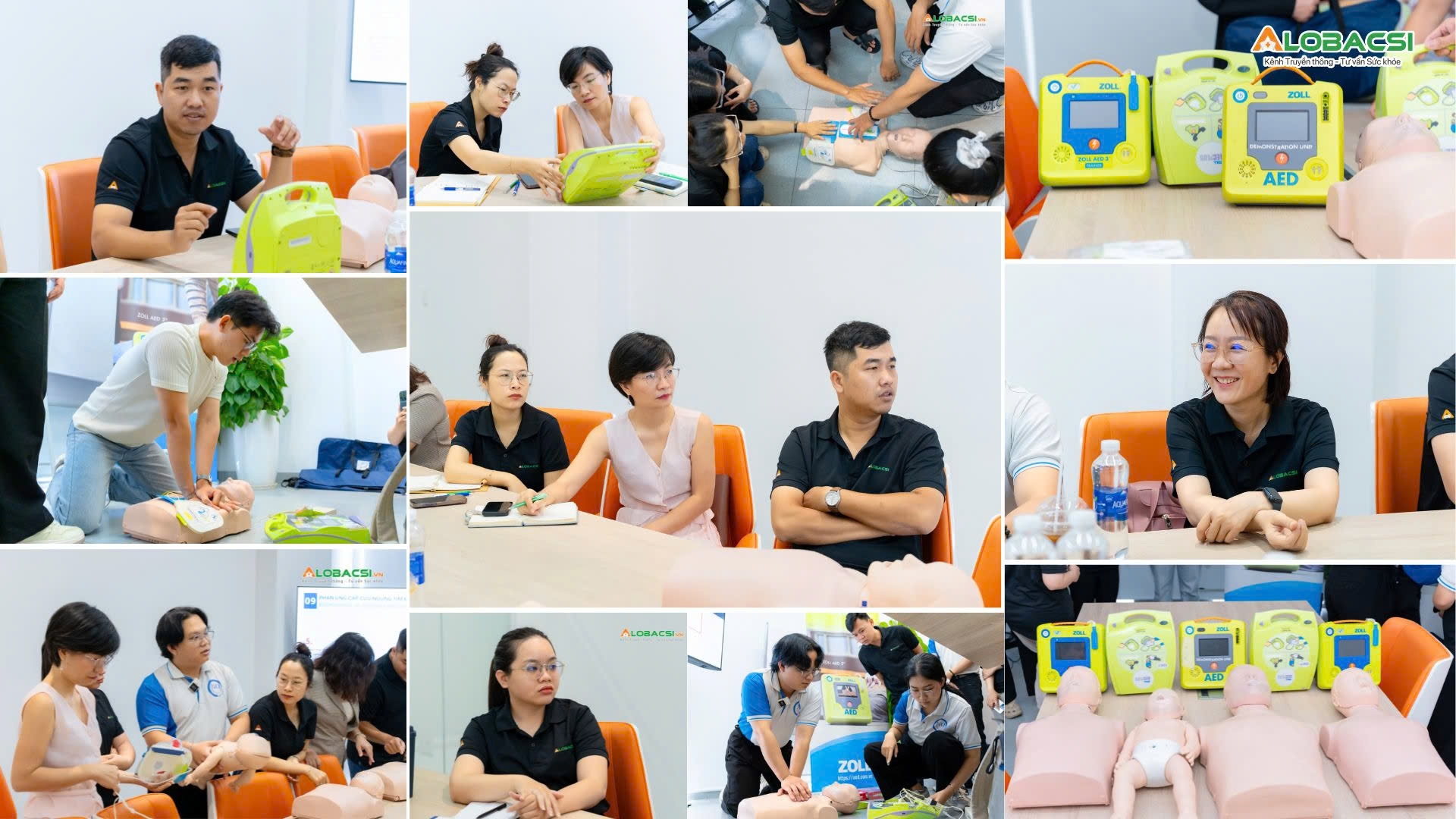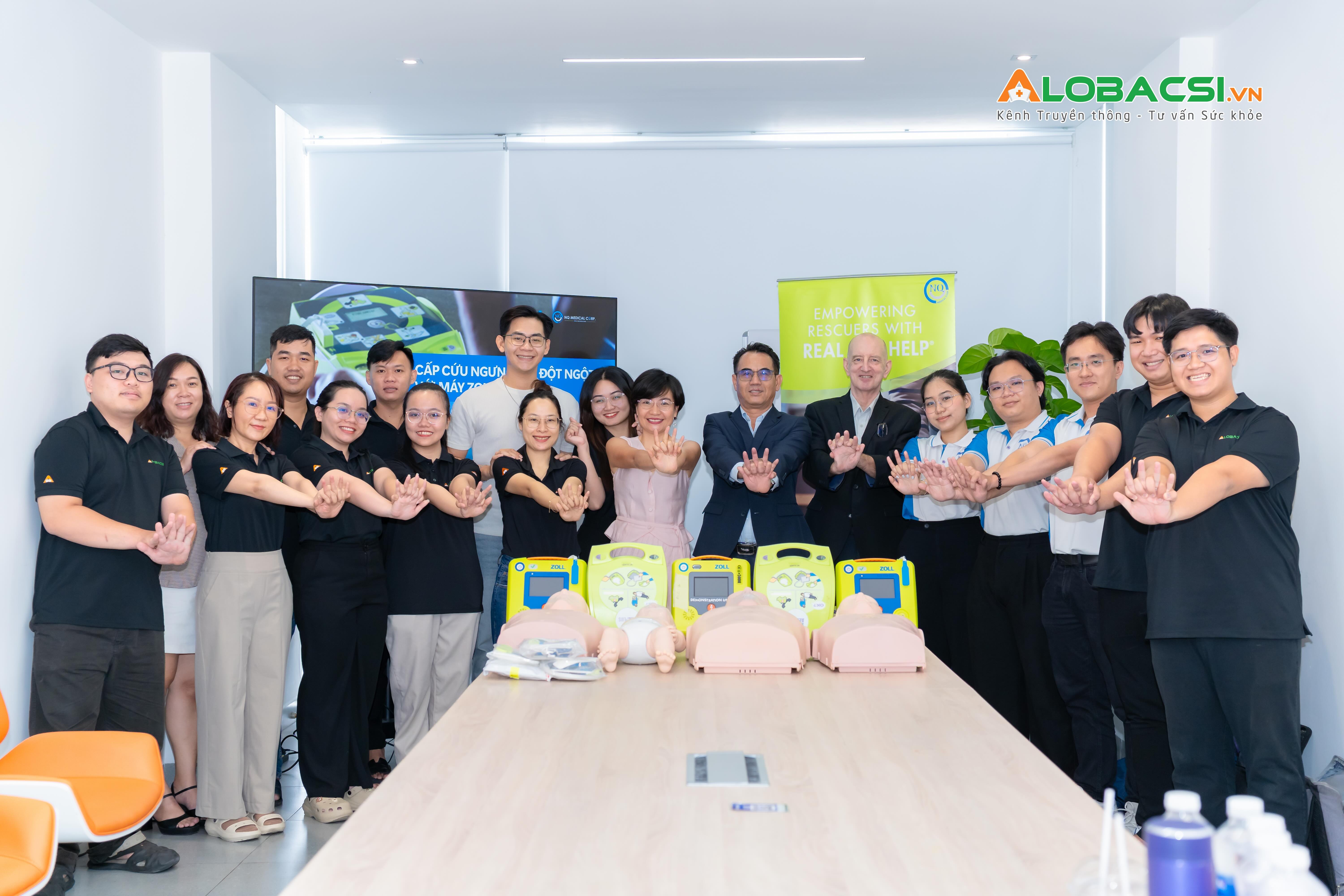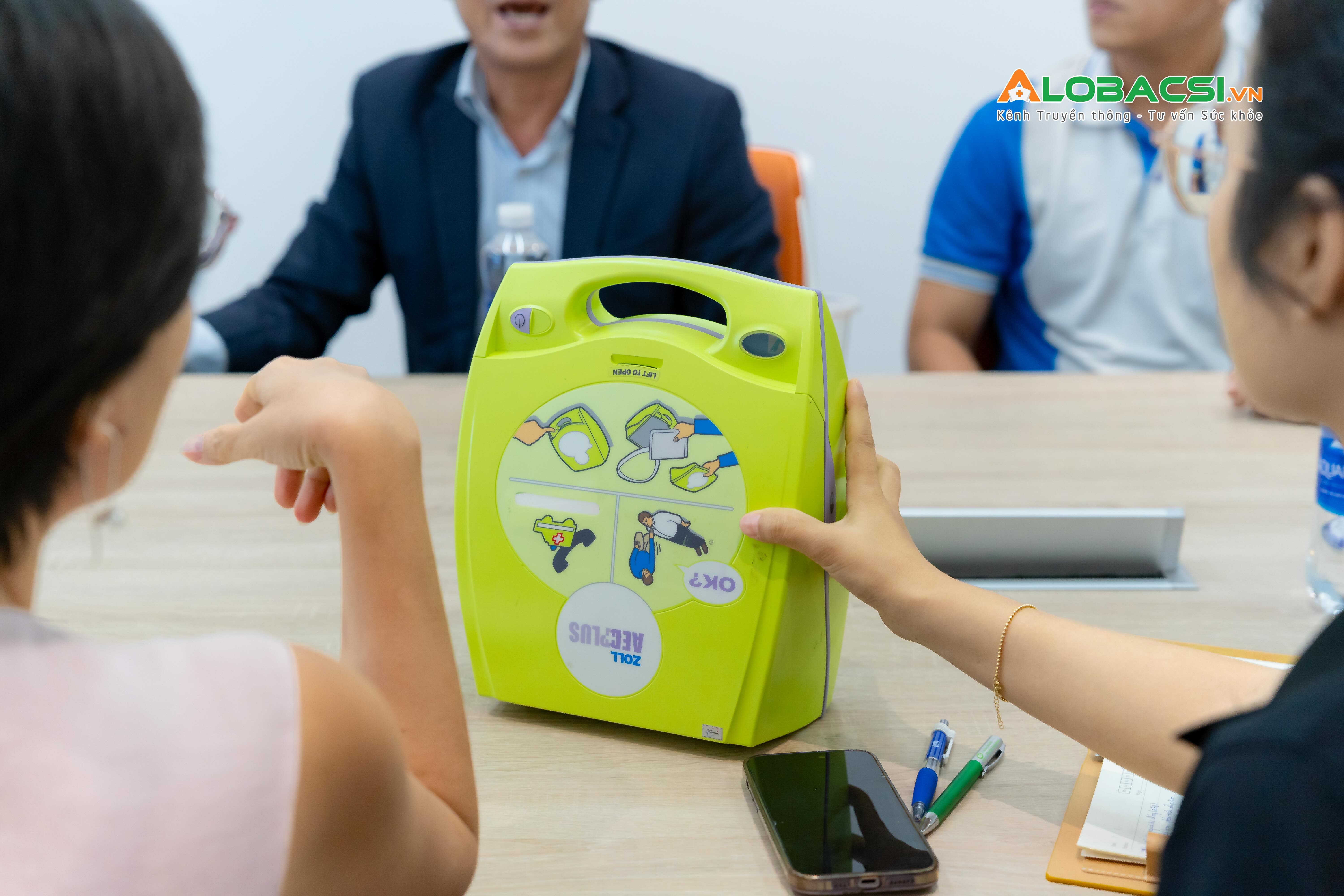 Hiểu rõ tầm quan trọng của “3-4 phút vàng”, AloBacsi đã phối hợp cùng Công ty Cổ phần Y Khoa NQ (NQ Medical Corp) tổ chức buổi tập huấn nội bộ về kỹ năng sơ cấp cứu ngừng tim. Chương trình được thiết kế dựa trên hướng dẫn của AHA, tập trung thực hành hồi sức tim phổi (CPR) và sử dụng máy sốc tim ngoài tự động ZOLL AED Plus - thiết bị có khả năng phản hồi lực ép và tần suất theo thời gian thực.