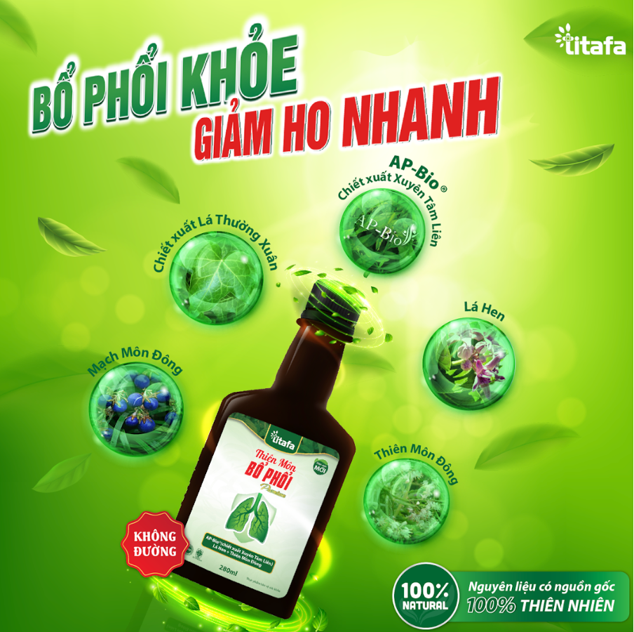 Với người lớn bị ho đờm, việc chọn siro phù hợp là chìa khóa nhanh chóng phục hồi. Thiên Môn Bổ Phổi Premium Titafa nổi bật nhờ công thức AP‑Bio® Xuyên tâm liên mới kết hợp lá thường xuân nhập khẩu và 11 thảo dược bổ phổi, mang lại hiệu quả bổ phổi, giảm ho, long đờm hiệu quả, an toàn, được chứng minh lâm sàng. Đây là lựa chọn đáng cân nhắc cho người trưởng thành cần giải pháp hỗ trợ bài bản, nguồn gốc rõ ràng.
