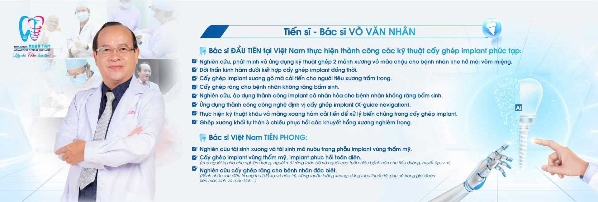 Tại Nha Khoa Nhân Tâm, đội ngũ bác sĩ được đào tạo bài bản trong lĩnh vực cấy ghép Implant, được dẫn dắt chuyên môn bởi Tiến sĩ, Bác sĩ Võ Văn Nhân - là một trong những chuyên gia Implant có nhiều năm kinh nghiệm, được đào tạo bài bản trong nước và quốc tế.