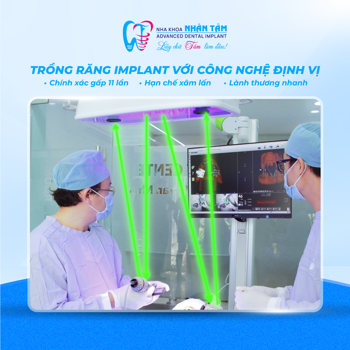 Tại Nha Khoa Nhân Tâm, quy trình điều trị Implant được thực hiện nghiêm ngặt, kỹ lưỡng với sự hỗ trợ của nhiều công nghệ nha khoa hiện đại như công nghệ định vị X-Guide, kính hiển vi nha khoa, công nghệ lấy dấu răng kỹ thuật số, công nghệ chế tác răng sứ tự động CAD/CAM, phần mềm lập kế hoạch Implant kỹ thuật số và hệ thống định vị phẫu thuật.