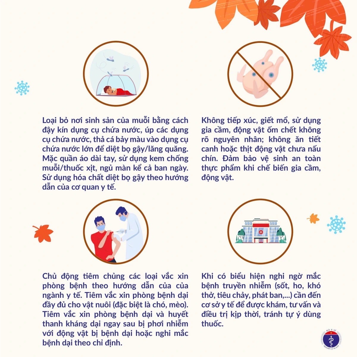 Song song đó, Bộ Y tế yêu cầu đẩy mạnh tiêm chủng mở rộng, đảm bảo miễn dịch phòng bệnh cho trẻ em, rà soát tiêm bù, tiêm vét cho các trường hợp còn thiếu mũi. Ngành Y tế cũng phối hợp chặt chẽ với ngành Giáo dục, Nông nghiệp và các khu công nghiệp trong việc giám sát, vệ sinh môi trường, phát hiện sớm ổ dịch ở người và động vật.