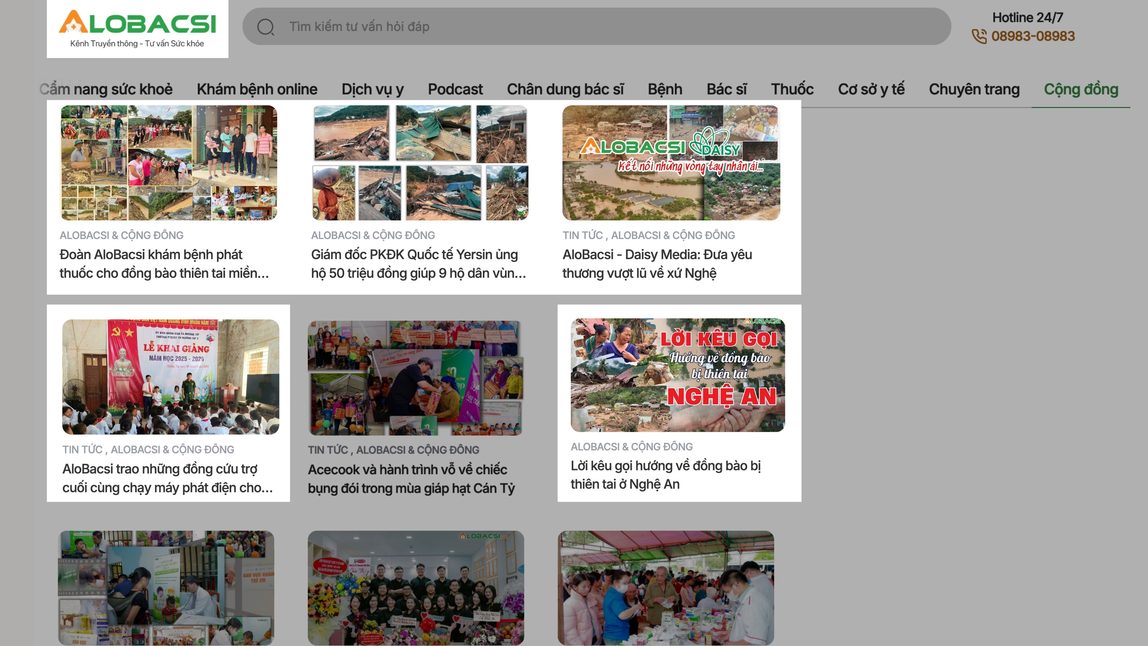 - Tiếp đó, sau bão số 10 và 11, trong tháng 10/2025, AloBacsi và Daisy Media phối hợp cùng Bệnh viện Đa khoa Quốc tế Thu Cúc triển khai hành trình “Tiếp sức sau lũ dữ” tại Thái Nguyên (14/10), Thanh Hóa (15/10) và Nghệ An (16/10), với tổng nguồn lực gần 400 triệu đồng. Nguồn lực này được đóng góp từ tấm lòng của bác sĩ, dược sĩ, nha sĩ, điều dưỡng, các đối tác thân thiết như DHG Pharma, Traphaco, Dược phẩm Hoa Linh, Công ty Cổ phần Dược phẩm Trí Dược, cùng người thân trong đại gia đình AloBacsi.
