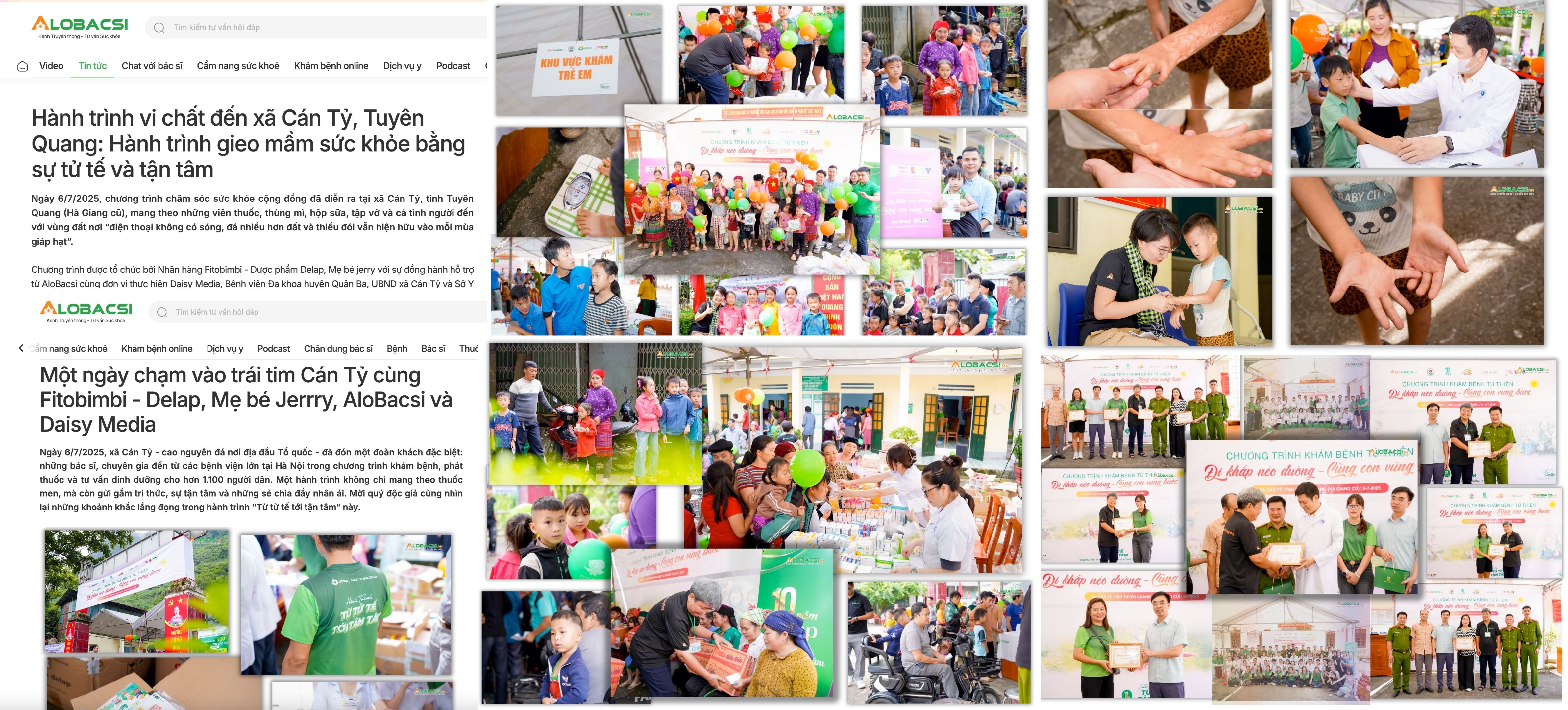 - Đặc biệt, nhân kỷ niệm 10 năm Dược phẩm Delap, AloBacsi cùng Fitobimbi - Delap - Mẹ Bé Jerry thực hiện hành trình “Từ tử tế đến tận tâm”, chăm sóc sức khỏe cho 1.100 bà con tại Tuyên Quang, lan tỏa triết lý phát triển sản phẩm tử tế song hành cùng trách nhiệm cộng đồng.