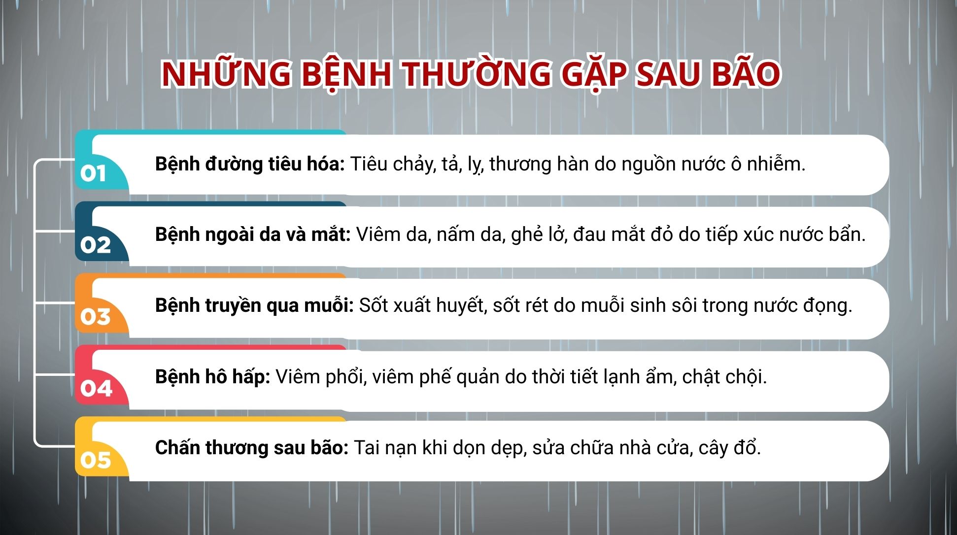 Theo khuyến cáo của Bộ Y tế, sau bão lũ, môi trường sống thường bị ô nhiễm nghiêm trọng do nước ngập, rác thải, xác động vật, cùng với điều kiện sinh hoạt thiếu thốn. Đây là thời điểm dễ phát sinh các bệnh về đường tiêu hóa như tiêu chảy, tả, lỵ, thương hàn. Nguyên nhân chủ yếu là do nguồn nước bị ô nhiễm và thực phẩm không được bảo quản an toàn. Người dân cần tuyệt đối không sử dụng nước chưa qua xử lý, nên đun sôi trước khi uống và ăn chín, uống sôi để giảm nguy cơ mắc bệnh.