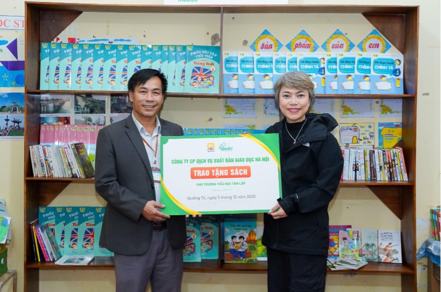 Chiều 5/12, tại điểm trường Bản Bù (Trường Tiểu học Tân Lập, huyện Hướng Hóa, tỉnh Quảng Trị), sương mù dày đặc và mưa lạnh vẫn phủ kín mái trường gỗ. Thế nhưng, trong không gian ẩm rét ấy đã diễn ra một buổi chiều thật ấm áp khi Công ty Cổ phần Dịch vụ Xuất bản Giáo dục Hà Nội phối hợp cùng AloBacsi và Daisy Media trao tặng hơn 10 đầu sách bài tập - từ Tiếng Anh, Toán đến Tự nhiên & Xã hội - dành cho học sinh khối 1 đến 5.