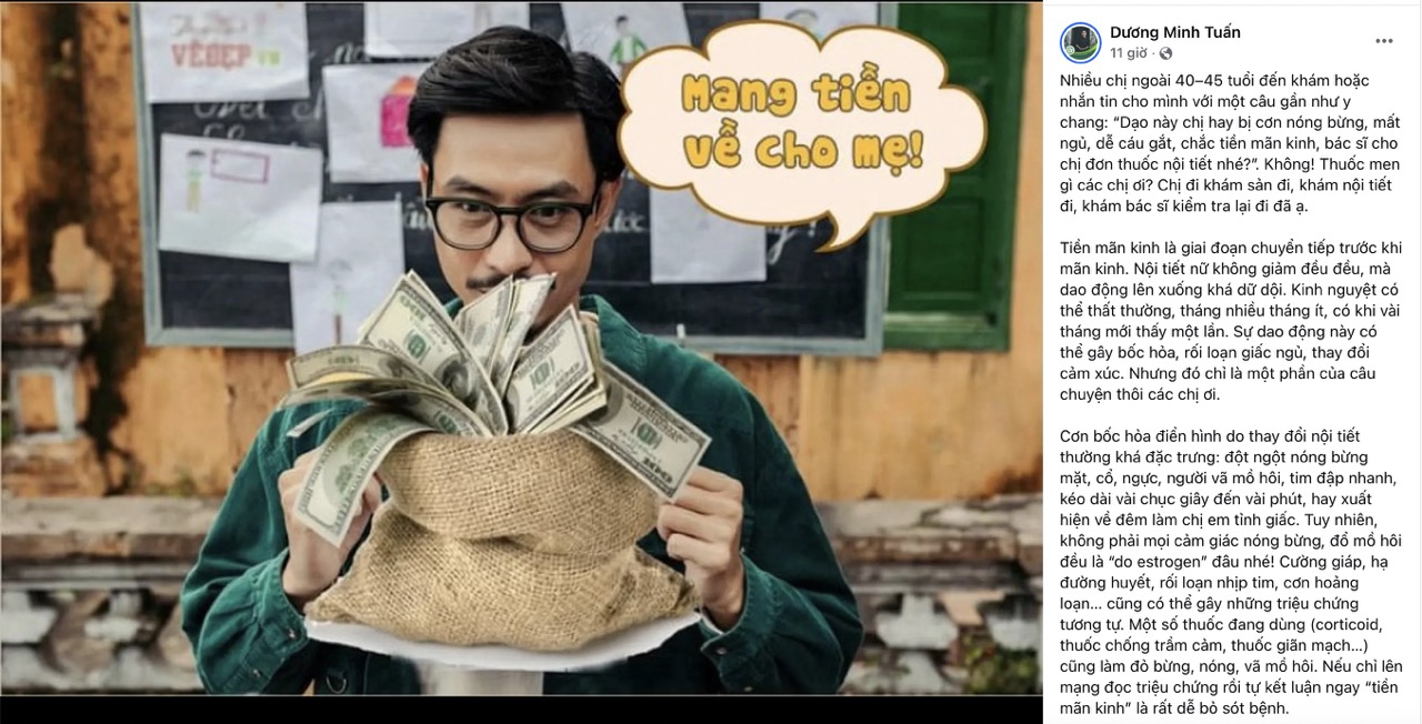 Kết bài chia sẻ, bác sĩ Tuấn nhắn nhủ: “Nếu các chị đang bốc hỏa, mất ngủ, mệt mỏi, thay đổi cảm xúc… thử kiểm tra lại TIỀN xem. Có khi thiếu tiền, hết tiền, cạn kiệt tiền đó chứ chưa chắc đã là… tiền mãn kinh đâu”.