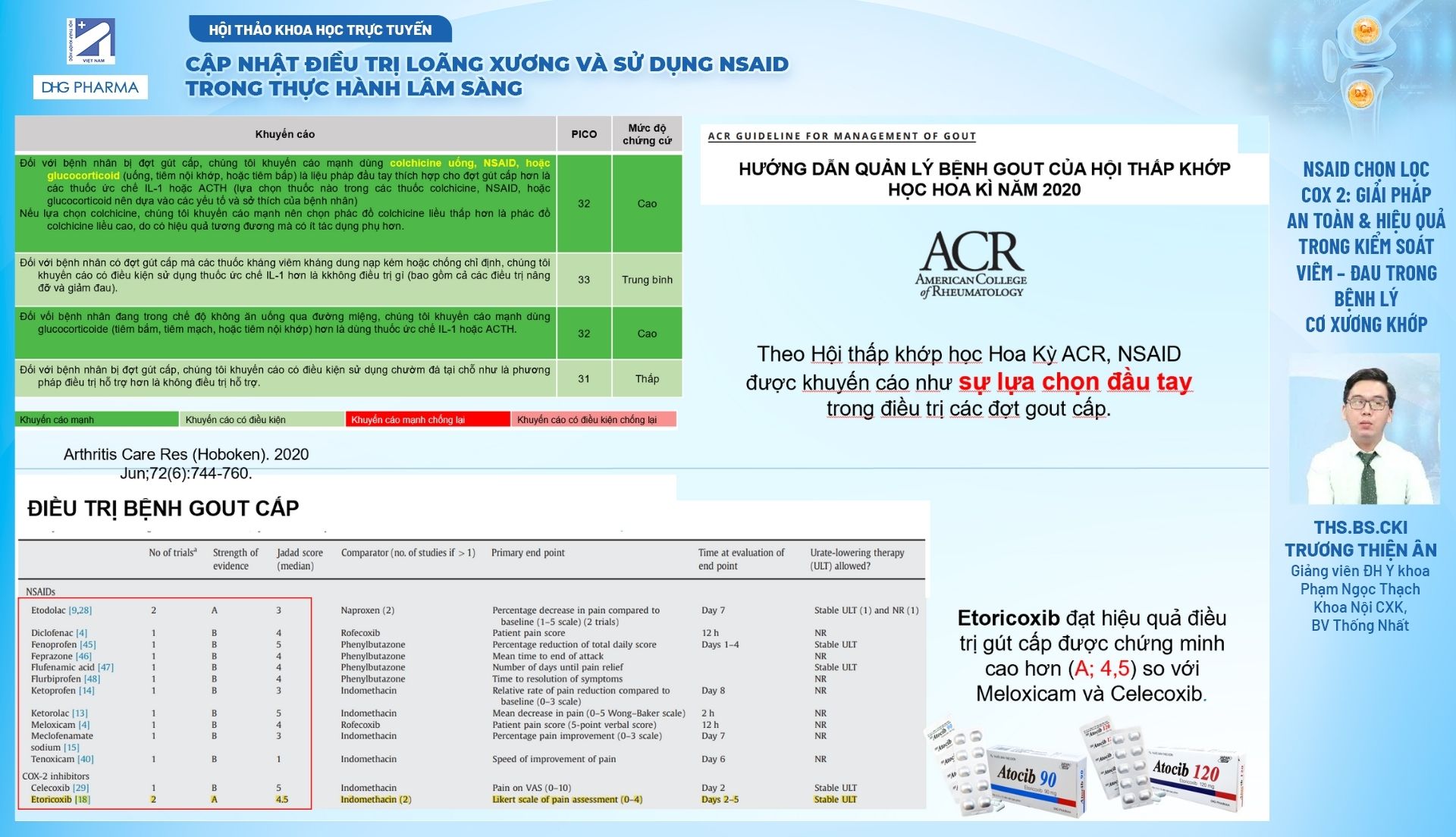 Ngày 7/9/2025, Hội Thấp khớp học Việt Nam tổ chức hội thảo khoa học trực tuyến với sự đồng hành từ nhãn hàng Atocib - DHG Pharma. Các chuyên gia mang đến góc nhìn toàn diện hơn về NSAID chọn lọc COX-2 trong quản lý viêm - đau cơ xương khớp và những cập nhật trong điều trị loãng xương, đặc biệt nhấn mạnh vai trò bổ sung Canxi - Vitamin D3.