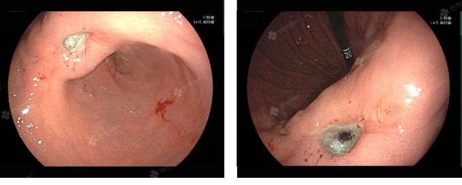 Từ hình ảnh nội soi, bác sĩ chẩn đoán xuất huyết tiêu hóa trên do loét dạ dày (Forrest IIC) kèm loét đa ổ hành tá tràng.