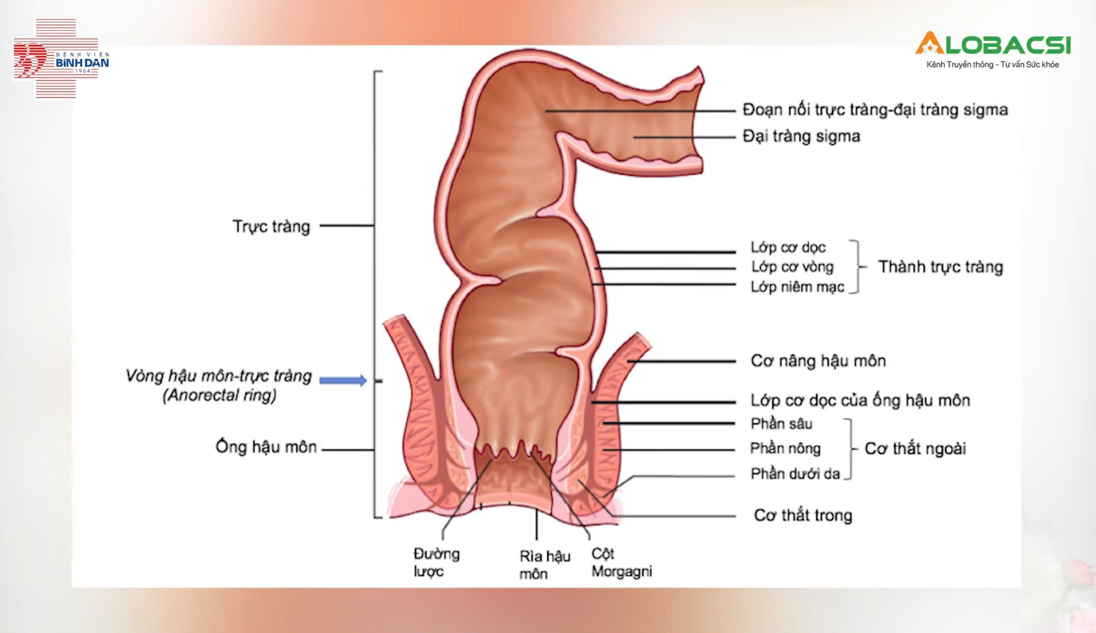 Trực tràng là đoạn cuối của ống tiêu hóa nằm sát với hậu môn, tính từ bờ hậu môn lên khoảng 15cm, phía trên đó là đại tràng.