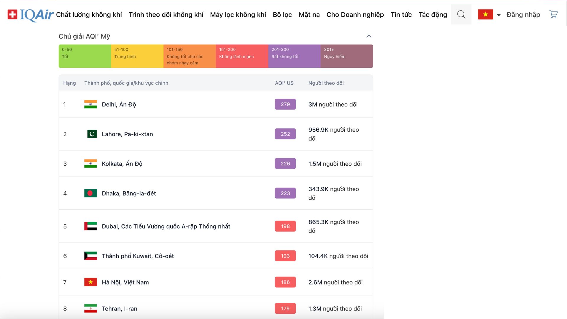 Ứng dụng IQAir xếp Hà Nội vào nhóm đô thị ô nhiễm nhất thế giới, đứng thứ 8 sáng nay; nồng độ PM2.5 cao gấp 18 lần khuyến cáo trung bình năm của WHO.