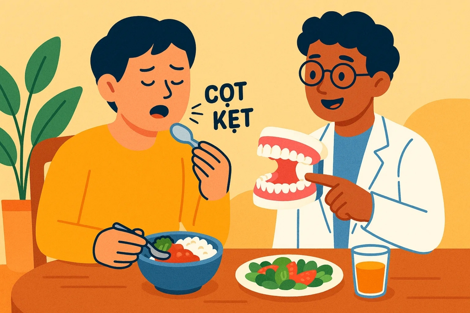 Một số bệnh nhân cho biết, khi ăn uống hoặc trong lúc ngủ, họ nghe thấy tiếng “cọt kẹt” trong miệng. Tình trạng này đôi khi xuất hiện sau khi làm răng tháo lắp hoặc bọc răng sứ.
