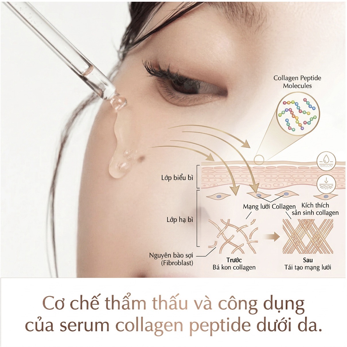 Đặc biệt hiện nay, công nghệ làm đẹp đã tiến thêm một bước dài với sự ra đời của serum collagen peptide. Đây là dạng collagen thủy phân có kích thước phân tử siêu nhỏ, giúp da hấp thụ tối đa và nhanh chóng phục hồi các sợi elastin bị đứt gãy. Khi sử dụng serum collagen peptide, làn da không chỉ được cấp ẩm mà còn tạo ra hiệu ứng căng bóng, đàn hồi rõ rệt.