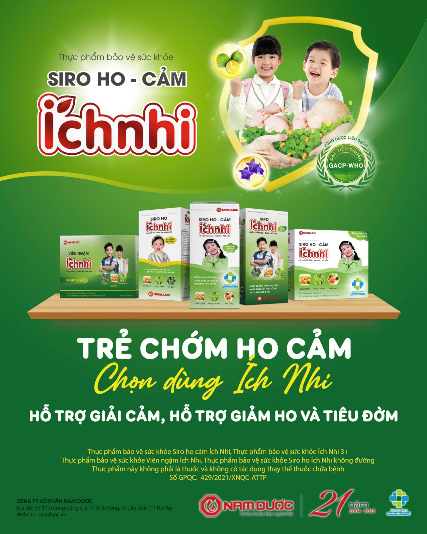 Thực phẩm bảo vệ sức khỏe Siro ho cảm Ích Nhi là một trong những gợi ý sử dụng cho trẻ nhỏ. Sản phẩm có tác dụng vừa hỗ trợ giải cảm, hỗ trợ giảm sổ mũi, vừa hỗ trợ giảm ho, đờm, hỗ trợ tăng cường sức đề kháng và có hương vị thơm ngon, dễ uống. Thực phẩm bảo vệ sức khỏe Siro ho cảm Ích Nhi có vùng trồng dược liệu sạch đạt chuẩn quốc tế GACP-WHO: Quất (Vụ Bản, Nam Đinh), cát cánh (Bắc Hà, Lào Cai)... cung cấp nguyên liệu sản xuất siro cho trẻ.
